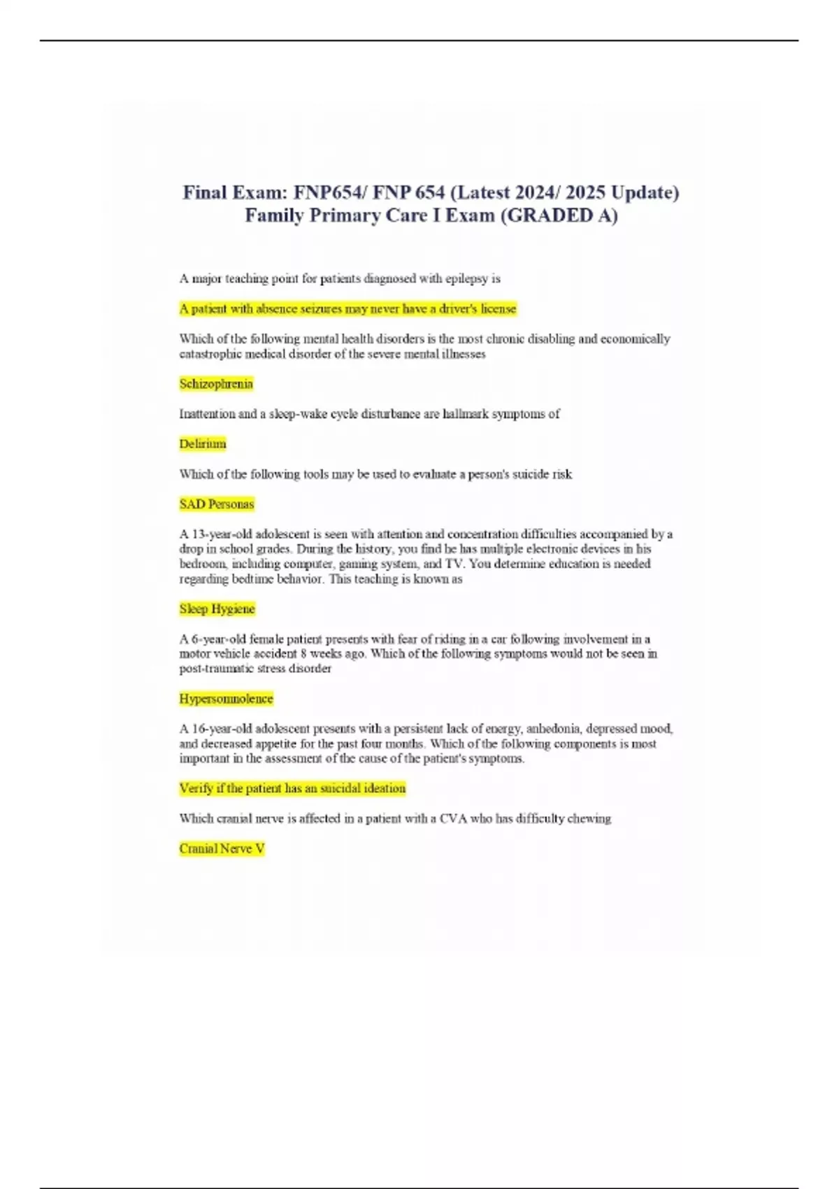 Final Exam FNP654 FNP 654 (Latest Update) Family Primary Care I Exam (GRADED A)