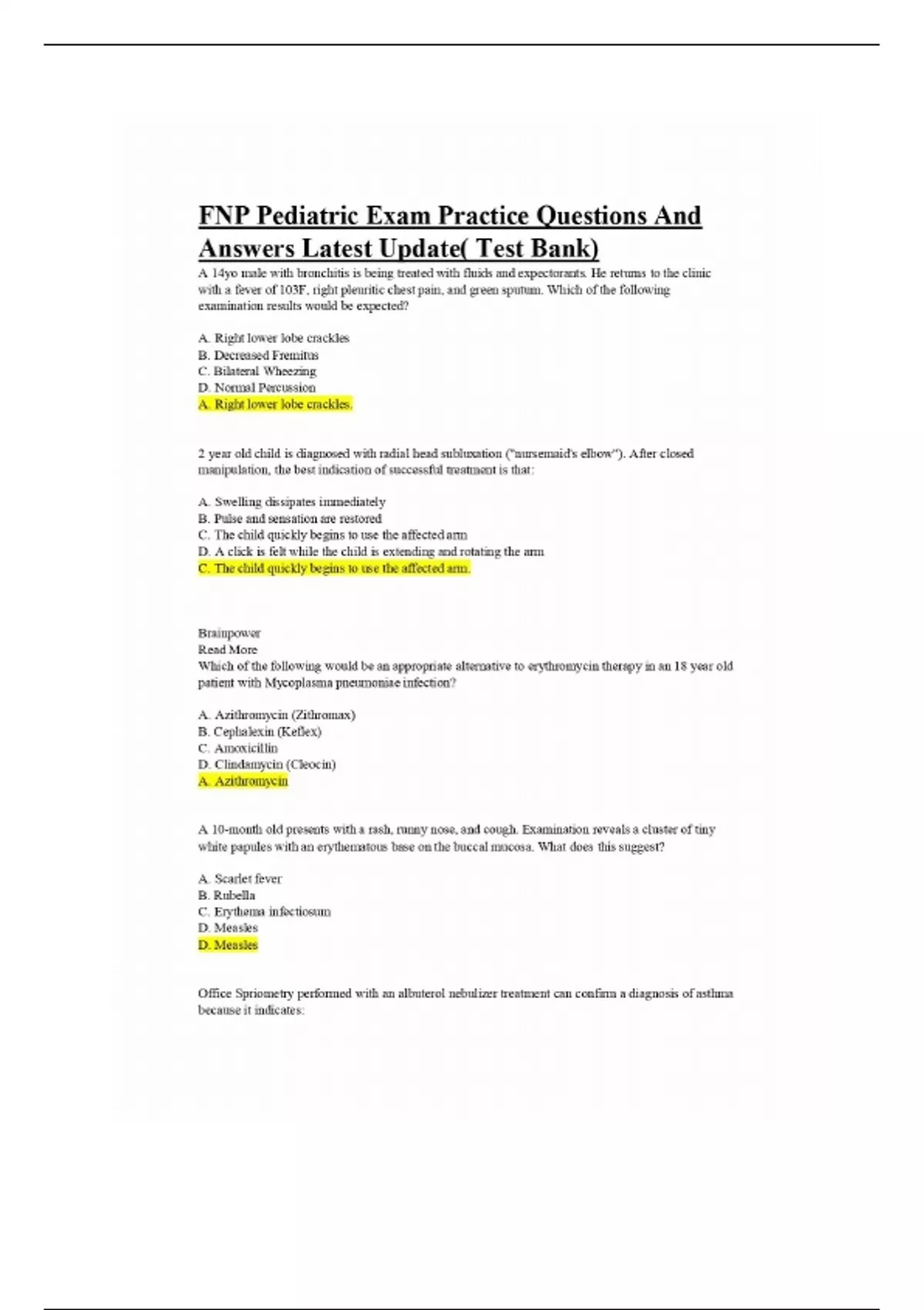FNP Pediatric Exam Practice Questions And Answers Latest Update( Test Bank)