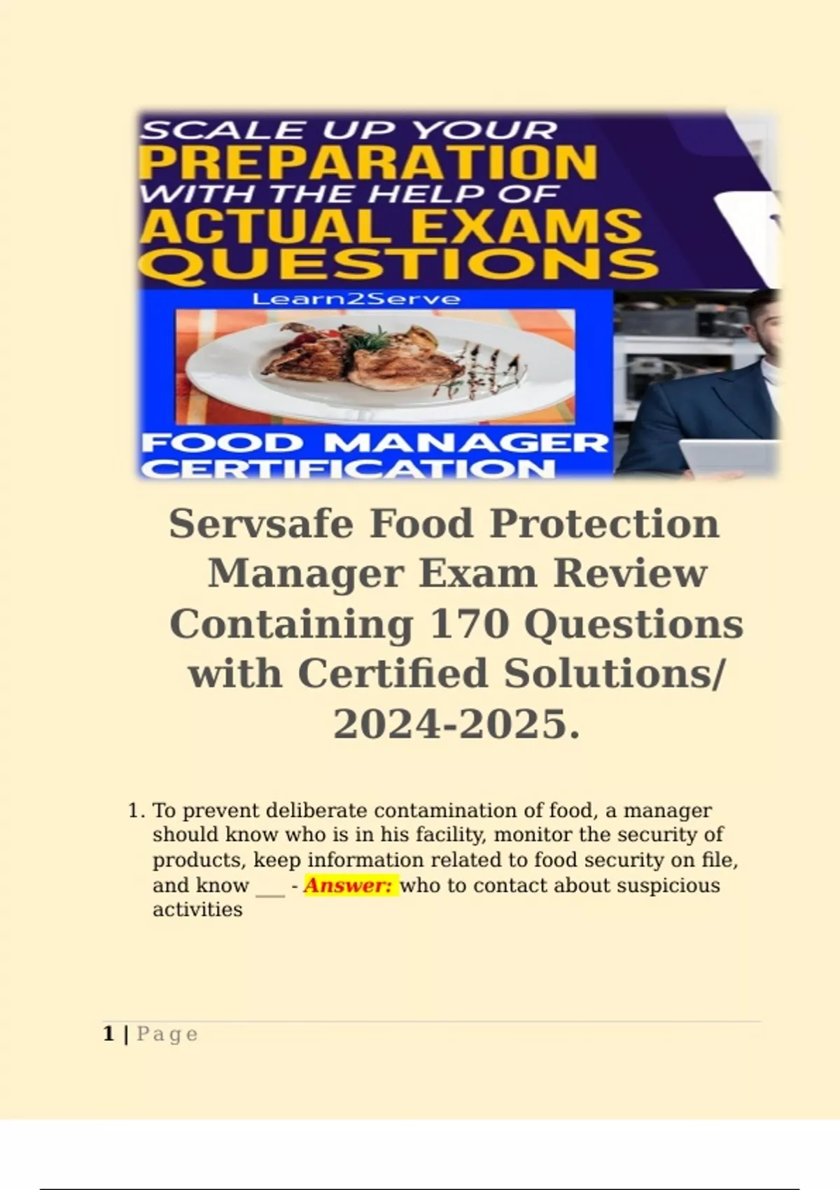 Servsafe Food Protection Manager Exam Review Containing 170 Questions with Certified Solutions/ .
