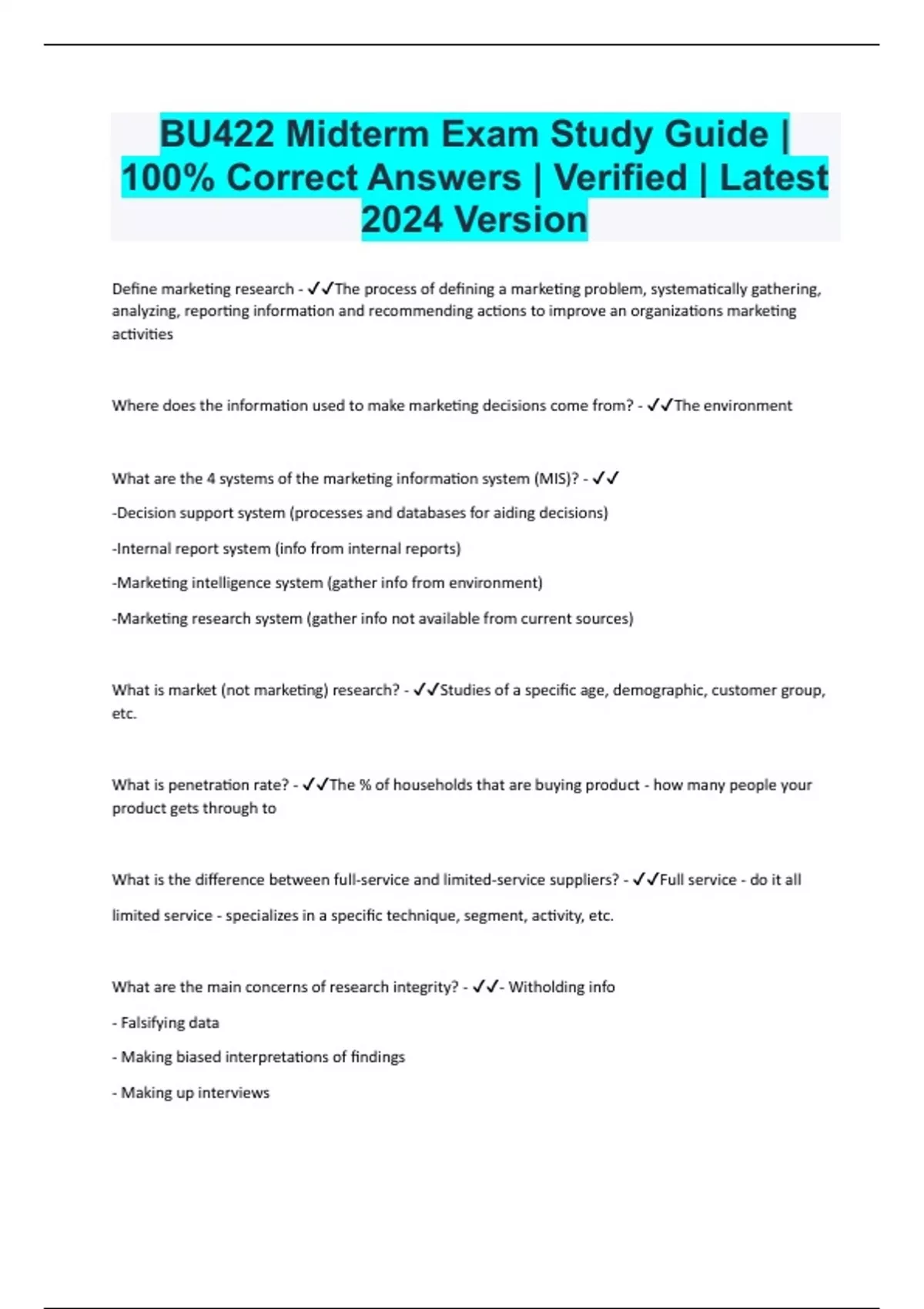 BU422 Midterm Exam Study Guide | 100% Correct Answers | Verified | Latest 2024 Version Define marketing research - The process of defining a marketing problem, systematically gathering, analyzing, reporting information and recommending actions to improve an organizations marketing activities Where does the information used to make marketing decisions come from? - The environment What are the 4 systems of the marketing information system (MIS)? - -Decision support system (processes and databases for aiding decisions) -Internal report system (info from internal reports) -Marketing intelligence system (gather info from environment) -Marketing research system (gather info not available from current sources) What is market (not marketing) research? - Studies of a specific age, demographic, customer group, etc. What is penetration rate? - The % of households that are buying product - how many people your product gets through to What is the difference between full-service and limited-service suppliers? - Full service - do it all limited service - specializes in a specific technique, segment, activity, etc. What are the main concerns of research integrity? - - Witholding info - Falsifying data - Making biased interpretations of findings - Making up interviews- Taking shortcuts - Using RFP (request for proposals) to steal ideas What is the first step of the marketing research process? When are all 11 steps always needed? - Determine if marketing research is needed - All 11 steps not always necessary - All 11 steps are usually necessary when collecting primary data What are some instances where marketing research would not be necessary? - - Cost precedes value - Implementation is not feasible - Time constraints (market moving too fast) - Strategical reasons - Info already available What is the second step of the marketing research problem? - Define the problem - Most important step What is the difference between a failure to meet objectives and a missed o