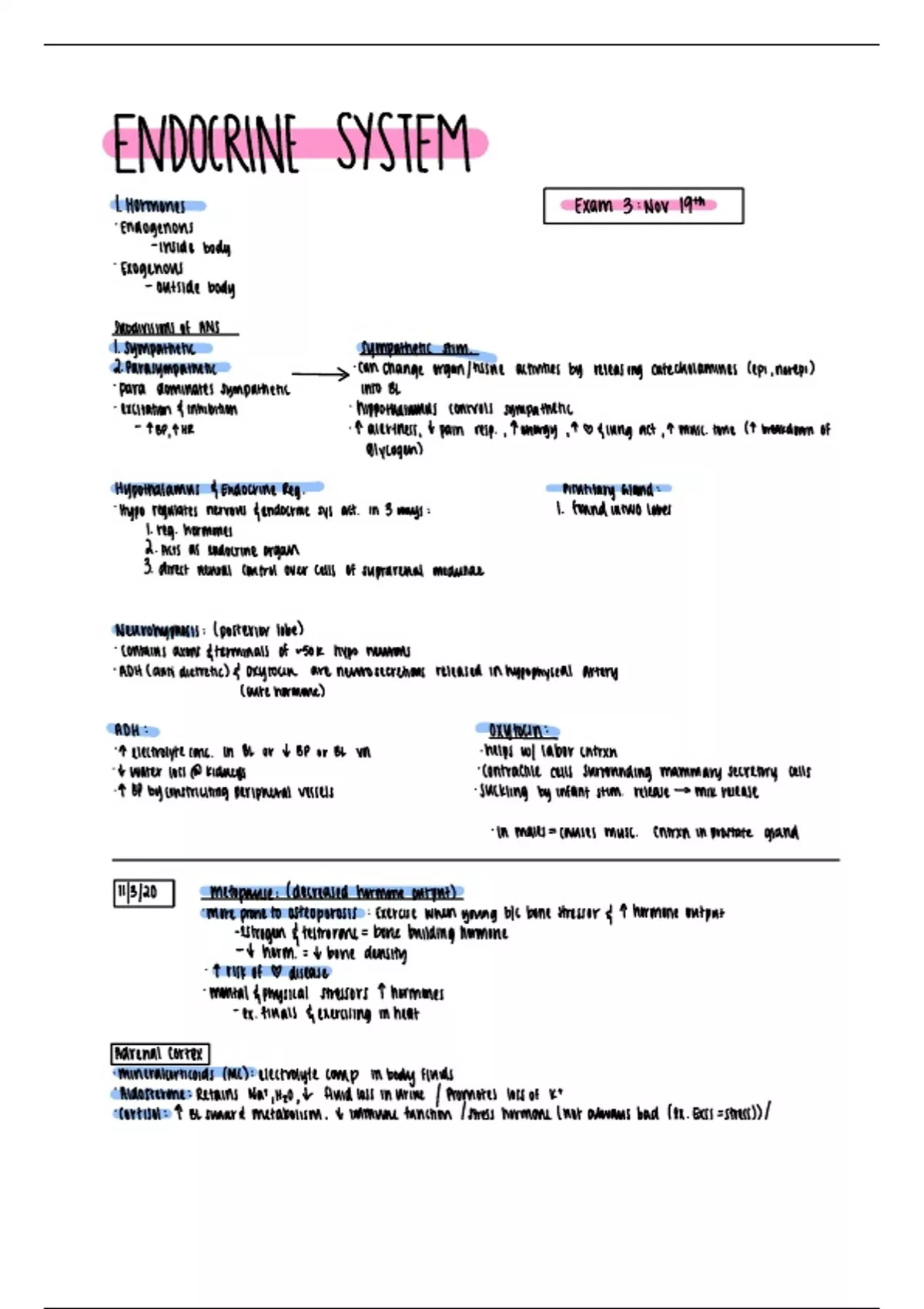 Endocrine system notes reviewing lymph nodes and other functions of the hormones of the body.