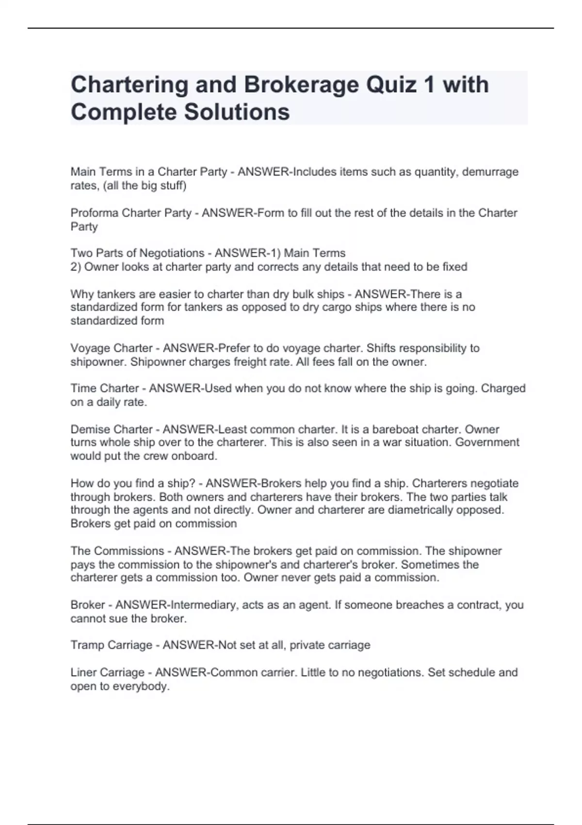 Chartering and Brokerage Quiz 1 with Complete SolutionsChartering and Brokerage Quiz 1 with Complete SolutionsChartering and Brokerage Quiz 1 with Complete SolutionsChartering and Brokerage Quiz 1 with Complete SolutionsChartering and Brokerage Quiz 1 with Complete Solutions Main Terms in a Charter Party - ANSWER-Includes items such as quantity, demurrage rates, (all the big stuff) Proforma Charter Party - ANSWER-Form to fill out the rest of the details in the Charter Party Two Parts of Negotiations - ANSWER-1) Main Terms 2) Owner looks at charter party and corrects any details that need to be fixed Why tankers are easier to charter than dry bulk ships - ANSWER-There is a