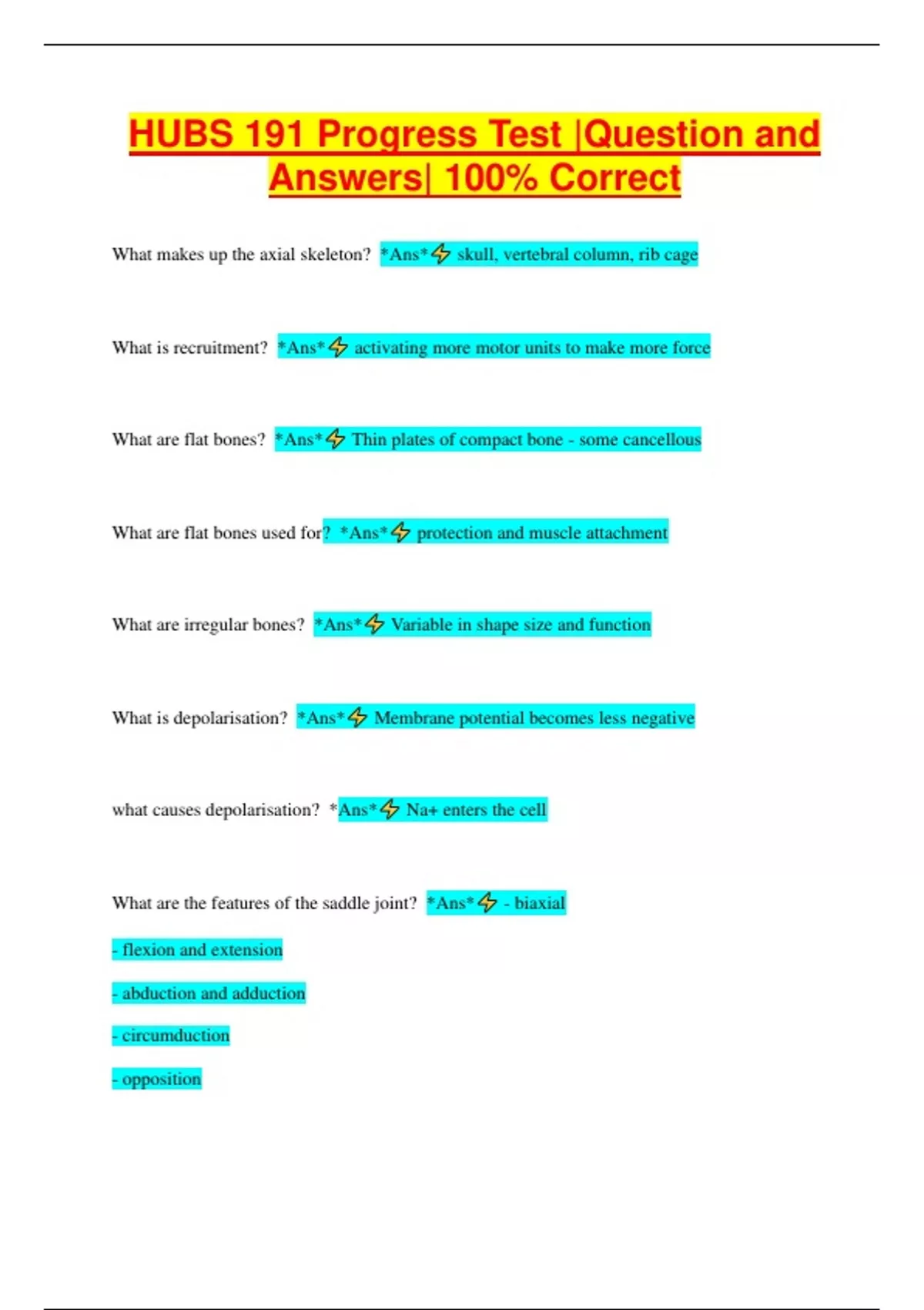 HUBS 191 Progress Test |Question and Answers| 100% Correct What makes up the axial skeleton? *Ans* skull, vertebral column, rib cage What is recruitment? *Ans* activating more motor units to make more force What are flat bones? *Ans* Thin plates of compact bone - some cancellous What are flat bones used for? *Ans* protection and muscle attachment What are irregular bones? *Ans* Variable in shape size and function What is depolarisation? *Ans* Membrane potential becomes less negative what causes depolarisation? *Ans* Na+ enters the cell What are the features of the saddle joint? *Ans* - biaxial - flexion and extension - abduction and adduction - circumduction - opposition - e.g. carpometacarpal joint (thumb) What does skeletal muscle do? *Ans* - develop force - control posture - resist movement of joints - under voluntary control - provide support and protection for soft internal organs - voluntary control over major openings - converts energy (in part) to heat to maintain core temperature - provide a major store for energy and protein What is membrane potential typical value? *Ans* -70mV What maintains the membrane potential? *Ans* sodium potassium pump what does a neutraliser muscle do? *Ans* eliminate an unwanted movement caused by another muscle What is hypotonic? what does it cause? *Ans* too much water in ECF causes cell to swell what is a continuous variable? *Ans* a variable that can take on any value where is the pubis located? *Ans* anterior aspect of the pelvic girdle articulates with the other pubis to form the pubic symphysis what is the structure of fibrocartilage? *Ans* collagen fibres form bundles throughout matrix orientation of fibres align with stresses function is to resist compression and tension what is plantar flexion? *Ans* toes pointing to the ground how is contraction of a muscle terminated? *Ans* Ca2+ levels fall in sarcoplasm what is a categorical variable? *Ans* can summarise variables into categories or groups what is inversion of the foot? *Ans* sole of foot faces towards midline