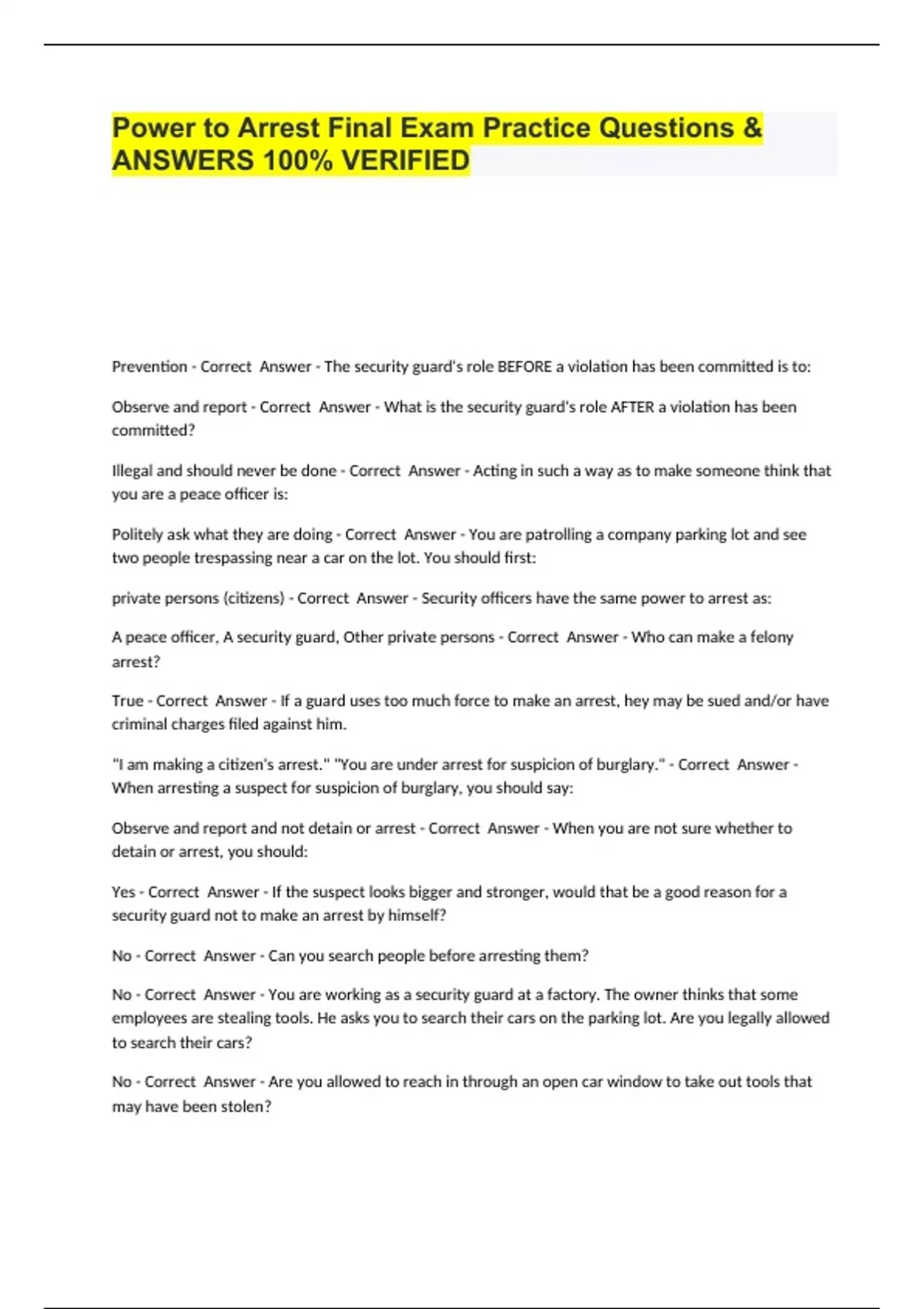Power to Arrest Final Exam Practice Questions & ANSWERS 100% VERIFIED.