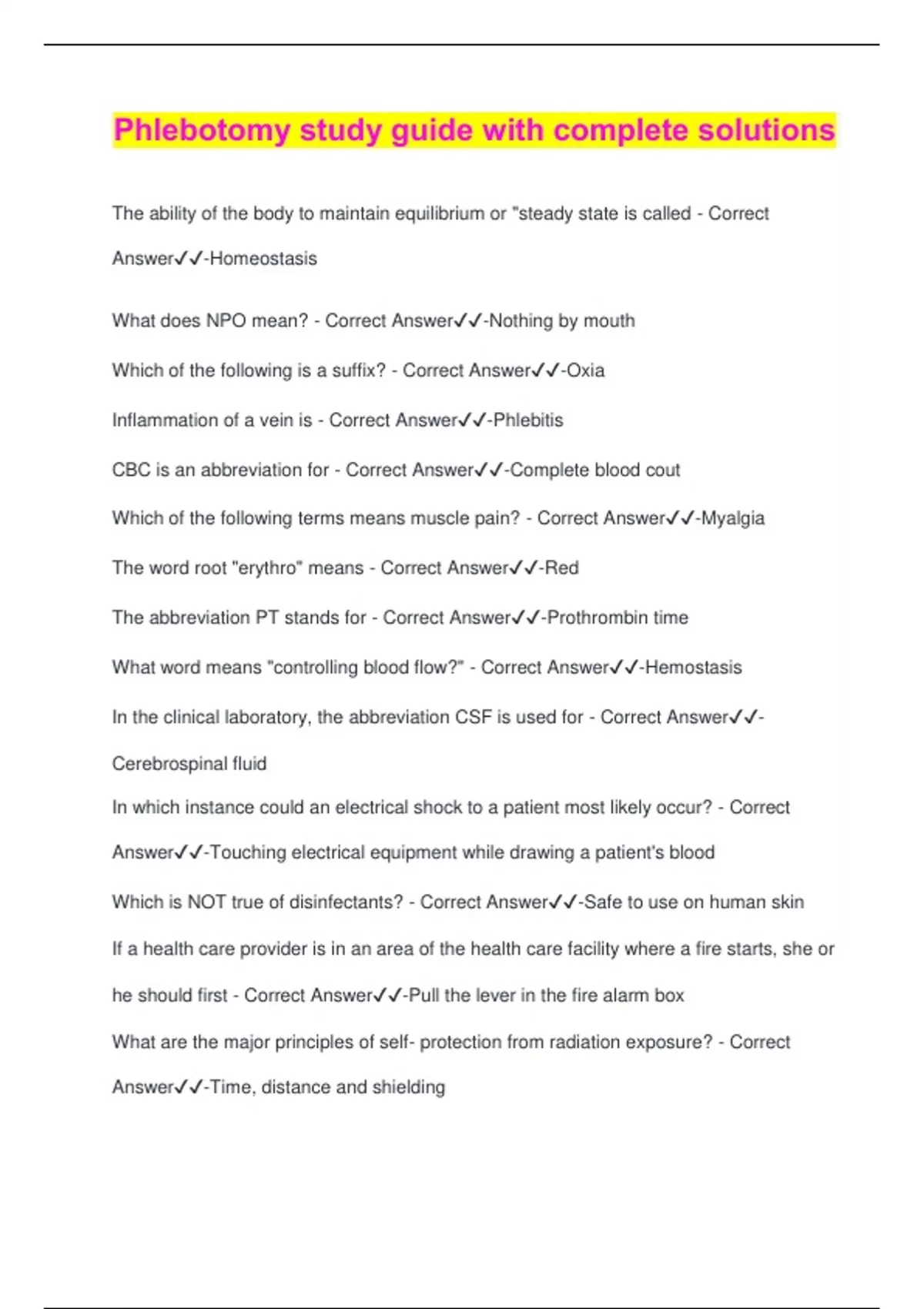 Phlebotomy study guide with complete solutions The ability of the body to maintain equilibrium or "steady state is called - Correct Answer️️ -Homeostasis What does NPO mean? - Correct Answer️️ -Nothing by mouth Which of the following is a suffix? - Correct Answer️️ -Oxia Inflammation of a vein is - Correct Answer️️ -Phlebitis CBC is an abbreviation for - Correct Answer️️ -Complete blood cout Which of the following terms means muscle pain? - Correct Answer️️ -Myalgia The word root "erythro" means - Correct Answer️️ -Red The abbreviation PT stands for - Correct Answer️️ -Prothrombin time What word means "controlling blood flow?" - Correct Answer️️ -Hemostasis In the clinical laboratory, the abbreviation CSF is used for - Correct Answer️️ - Cerebrospinal fluid In which instance could an electrical shock to a patient most likely occur? - Correct Answer️️ -Touching electrical equipment while drawing a patient's blood Which is NOT true of disinfectants? - Correct Answer️️ -Safe to use on human skin If a health care provider is in an area of the health care facility where a fire starts, she or he should first - Correct Answer️️ -Pull the lever in the fire alarm box What are the major principles of self- protection from radiation exposure? - Correct Answer️️ -Time, distance and shielding