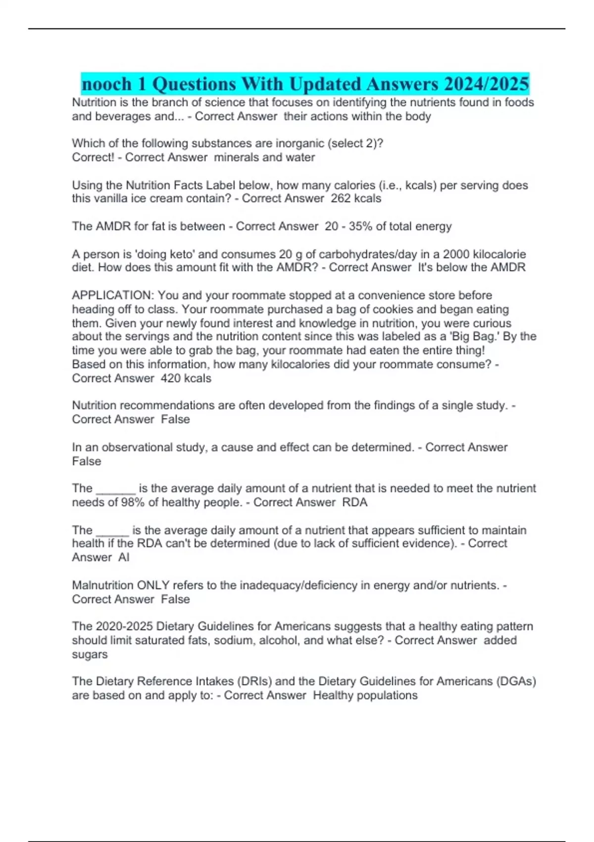 nooch 1 Questions With Updated Answers 2024/2025 Nutrition is the branch of science that focuses on identifying the nutrients found in foods and beverages and... - Correct Answer their actions within the body Which of the following substances are inorganic (select 2)? Correct! - Correct Answer minerals and water Using the Nutrition Facts Label below, how many calories (i.e., kcals) per serving does this vanilla ice cream contain? - Correct Answer 262 kcals The AMDR for fat is between - Correct Answer 20 - 35% of total energy A person is 'doing keto' and consumes 20 g of carbohydrates/day in a 2000 kilocalorie diet. How does this amount fit with the AMDR? - Correct Answer It's below the AMDR APPLICATION: You and your roommate stopped at a convenience store before heading off to class. Your roommate purchased a bag of cookies and began eating them. Given your newly found interest and knowledge in nutrition, you were curious about the servings and the nutrition content since this was labeled as a 'Big Bag.' By the time you were able to grab the bag, your roommate had eaten the entire thing! Based on this information, how many kilocalories did your roommate consume? - Correct Answer 420 kcals Nutrition recommendations are often developed from the findings of a single study. - Correct Answer False In an observational study, a cause and effect can be determined. - Correct Answer False The ______ is the average daily amount of a nutrient that is needed to meet the nutrient needs of 98% of healthy people. - Correct Answer RDA The _____ is the average daily amount of a nutrient that appears sufficient to maintain health if the RDA can't be determined (due to lack of sufficient evidence). - Correct Answer AI Malnutrition ONLY refers to the inadequacy/deficiency in energy and/or nutrients. - Correct Answer False The Dietary Guidelines for Americans suggests that a healthy eating pattern should limit saturated fats, sodium, alcohol, and what else? - Correct Answer added sugars The Dietary Reference Intakes (DRIs) and the Dietary Guidelines