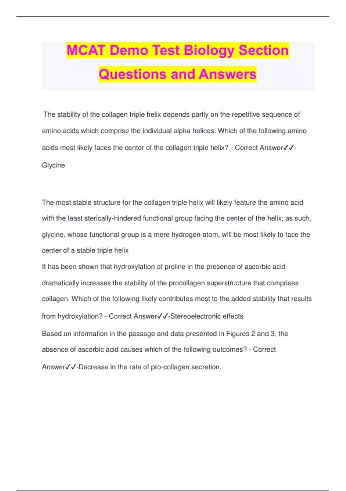 MCAT Demo Test Biology Section Questions and Answers The stability of the collagen triple helix depends partly on the repetitive sequence of amino acids which comprise the individual alpha helices. Which of the following amino acids most likely faces the center of the collagen triple helix? - Correct Answer️️ - Glycine The most stable structure for the collagen triple helix will likely feature the amino acid with the least sterically-hindered functional group facing the center of the helix; as such, glycine, whose functional group is a mere hydrogen atom, will be most likely to face the center of a stable triple helix It has been shown that hydroxylation of proline in the presence of ascorbic acid dramatically increases the stability of the procollagen superstructure that comprises collagen. Which of the following likely contributes most to the added stability that results from hydroxylation? - Correct Answer️️ -Stereoelectronic effects Based on information in the passage and data presented in Figures 2 and 3, the absence of ascorbic acid causes which of the following outcomes? - Correct Answer️️ -Decrease in the rate of pro-collagen secretion. Once radiolabeled for detection, which of the following amino acids would be LEAST likely to accurately measure the amount of non-procollagen secreted? - Correct Answer️️ -Hydroxyproline Hydroxyproline is considered a non-proteinogenic - or, "unnatural" - amino acid in the sense that it is not typically found in the proteins that comprise the body. In addition to its absence in the list of twenty-one proteinogenic amino acids (the usual 20 plus selenocysteine), it may be inferred from the passage that hydroxyproline is created specifically for the increased stability of collagen. Which of the following is an example of horizontal gene transfer? - Correct Answer️️ - Conjugation between an Hfr and an F- bacterium. According to the passage, horizontal gene transfer is a process in which an organism incorporates genetic material from another organism without being the offspring of that organism. Conjugation, the passing of genetic material from bacteria to bacteria via a conjugation bridge, is an example of this. The fact that the Sputnik genome contains both mimivirus and mamavirus genes supports the conclusion that it participates in a process similar to: - Correct Answer️️ - Transduction The Sputnik genome containing genes from its mamavirus host is similar to a bacteriophage viral genome that contains bacterial host genes, as happens in transduction Which of the following is a viral agent that could be used in the development of phage therapy? - Correct Answer️️ -T4-like coliphages Phage therapy is the use of bacteriophage to treat bacterial infections. As described in the passage, the theory is that the virus will attack the disease-causing bacteria and not the human host. Phage therapy would be a more effective treatment option than antibiotics in each of the following EXCEPT: - Correct Answer️️ -Meningitis caused by Staphylococcus aureus that are sensitive to the drug oxacillin. Phage Therapy would be effective for the following: Steomyelitis, a bone infection where circulation at the infection site is poor. Chronic urinary tract infection caused by a biofilm, a complex mixture of microbes that resist the effects of antibiotics. Pneumonia caused by penicillin-resistant Streptococcus pneumoniae. Which of the following is true regarding action potentials in cardiac cells? - Correct Answer️️ -Repolarization in both the pacemaker cells and myocytes is due to the efflux of potassium. One analytical tool for determining the amount of iron in blood is to treat the blood with cyanide ion, which complexes with the Fe2+ in hemoglobin and displaces the porphyrin to form the hexacyanoferrate(II) complex ion, [Fe(CN)6]4-. Which of the following statements supports the use of this method as a quantitative way of determining the iron concentration? - Correct Answer️️ -The formation constant (Kf) of the [Fe(CN)6]4- ion is much larger than that of the Fe2+-hemoglobin complex. A scientist has a vial of cells that can be grown on plates in the lab. She does a transformation experiment on these cells and isolates the RNA a few days later. Which of the following is true about the cells under study? - Correct Answer️️ -To extract the RNA, the researcher would have to break down the cell wall and the plasma membrane. Which of the following is true regarding the function of the right and left ventricles? - Correct Answer️️ -The right ventricle and left ventricle produce unequal systolic pressures, but have equal ejection fractions. The right ventricle only supplies the pulmonary circulation and would not require, nor have the ability, to produce the pressure needed to supply the systemic circulation, as the left ventricle does. A researcher studying the visual cortex attempts to record visually evoked responses from a single neuron but is not observing any change in the firing rate of action potentials when the stimulus is presented, regardless of how bright it is. What is the most likely reason for this observation? - Correct Answer️️ -The orientation of the stimulus is not ideal. The passage explains that sensory neurons display differing responses depending upon the stimulus. If the cell being recorded from responds to a light stimulus in one orientation, but not the other, this could explain the lack of a response An individual action potential in a model neuron results in 100 sodium ions crossing the cell membrane. Given that the sodium-potassium pump requires a single molecule of ATP per cycle, how many acetyl-CoA would be required to generate enough energy to extrude the new sodium in the cell via the pump? - Correct Answer️