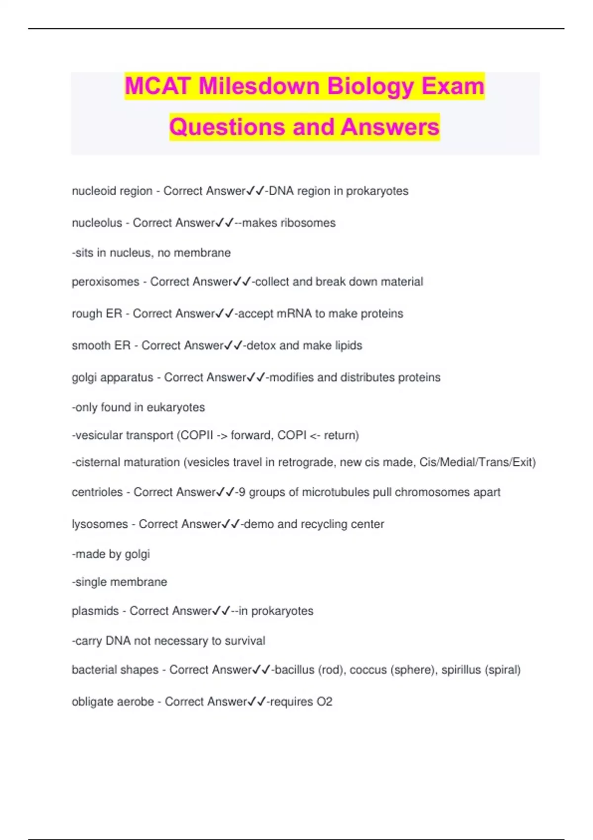 MCAT Milesdown Biology Exam Questions and Answers nucleoid region - Correct Answer️️ -DNA region in prokaryotes nucleolus - Correct Answer️️ --makes ribosomes -sits in nucleus, no membrane peroxisomes - Correct Answer️️ -collect and break down material rough ER - Correct Answer️️ -accept mRNA to make proteins smooth ER - Correct Answer️️ -detox and make lipids golgi apparatus - Correct Answer️️ -modifies and distributes proteins -only found in eukaryotes -vesicular transport (COPII -> forward, COPI <- return) -cisternal maturation (vesicles travel in retrograde, new cis made, Cis/Medial/Trans/Exit) centrioles - Correct Answer️️ -9 groups of microtubules pull chromosomes apart lysosomes - Correct Answer️️ -demo and recycling center -made by golgi -single membrane plasmids - Correct Answer️️ --in prokaryotes -carry DNA not necessary to survival bacterial shapes - Correct Answer️️ -bacillus (rod), coccus (sphere), spirillus (spiral) obligate aerobe - Correct Answer️️ -requires O2 obligate anaerobe - Correct Answer️️ -dies in O2 facultative anaerobe - Correct Answer️️ -toggle between aerobic/anaerobic aerotolerant anaerobe - Correct Answer️️ -does not use O2 but tolerates it gram + - Correct Answer️️ -purple, thick peptidoglycan/lipoteichoic acid cell wall gram - - Correct Answer️️ -pink or red, thin peptidoglycan cell wall and outer membrane eukaryotes - Correct Answer️️ --electron transport chain in mitochondria -large ribosomes -reproduce via mitosis prokaryotes - Correct Answer️️ --electron transport chain in cell membrane -small ribosomes -reproduce via binary fission -plasmids carry DNA material, may have virulence factors -plasmids that integrate into genome are episomes prions - Correct Answer️️ --infectious proteins -trigger misfolding (makes it go from alpha helical to beta pleated sheets) -lowers solubility viroid - Correct Answer️️ -plant pathogen microfilaments - Correct Answer️️ -actin microtubules - Correct Answer️️ -tubulin intermediate filaments - Correct Answer️️ --keratin= vimentin -desmin = lamin types of epithelia - Correct Answer️️ --simple -stratified -pseudostratified -cuboidal -columnar -squamous simple - Correct Answer️️ -one layer of cells stratified - Correct Answer️️ -multiple layers of cells pseudostratified - Correct Answer️️ -one layer but it appears as m