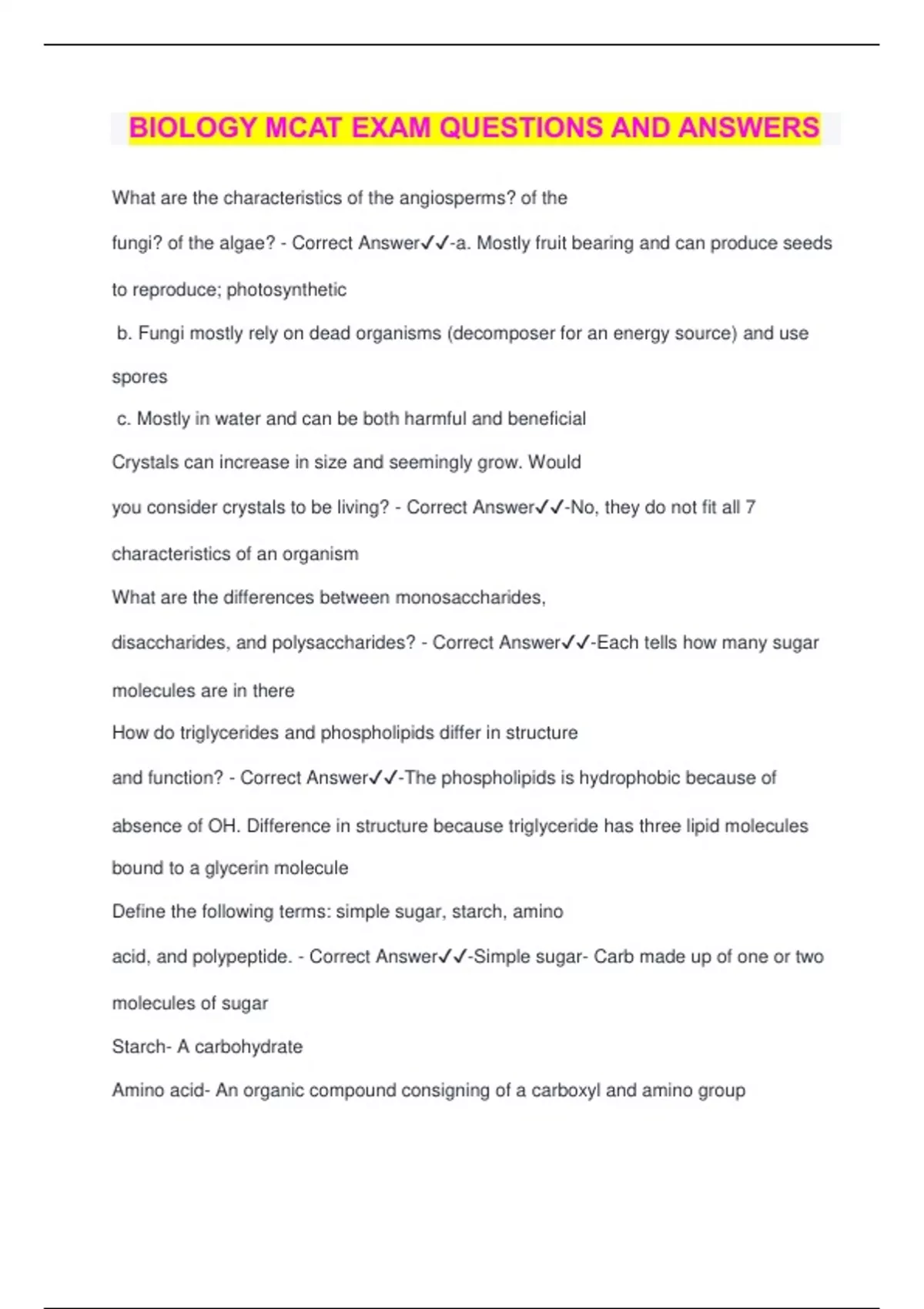 BIOLOGY MCAT EXAM QUESTIONS AND ANSWERS What are the characteristics of the angiosperms? of the fungi? of the algae? - Correct Answer️️ -a. Mostly fruit bearing and can produce seeds to reproduce; photosynthetic b. Fungi mostly rely on dead organisms (decomposer for an energy source) and use spores c. Mostly in water and can be both harmful and beneficial Crystals can increase in size and seemingly grow. Would you consider crystals to be living? - Correct Answer️️ -No, they do not fit all 7 characteristics of an organism What are the differences between monosaccharides, disaccharides, and polysaccharides? - Correct Answer️️ -Each tells how many sugar molecules are in there How do triglycerides and phospholipids differ in structure and function? - Correct Answer️️ -The phospholipids is hydrophobic because of absence of OH. Difference in structure because triglyceride has three lipid molecules bound to a glycerin molecule Define the following terms: simple sugar, starch, amino acid, and polypeptide. - Correct Answer️️ -Simple sugar- Carb made up of one or two molecules of sugar Starch- A carbohydrate Amino acid- An organic compound consigning of a carboxyl and amino group Polypetide- Made up of multiple amino acids What is the significance of the Cell Theory to biology? - Correct Answer️️ -It gives us the basic idea of where life could have all started. It also serves as a basis in medicine. List the parts of a plant cell, and for each part describe its structure and function. - Correct Answer️️ -Chloroplast- Helps in photosyntehsis Phopholipid bilayer- Facilitates what goes in and out of cell due to diffusion Cell wall- Encloses all other parts of the plant cell Describe the stages of mitosis. - Correct Answer️️ -Chromatin are split up and lined along the middle due to centromeres. And then spindles pull apart the chromosomes in order to lead to cytokinesis. Describe the similarities and differences between chloro- plasts and mitochondria. - Correct Answer️️ -They both help produce ATP, giving energy to the organism Differentiate between osmosis and diffusion. - Correct Answer️️ -Osmosis deals with water while diffusion deals with in or organic substan