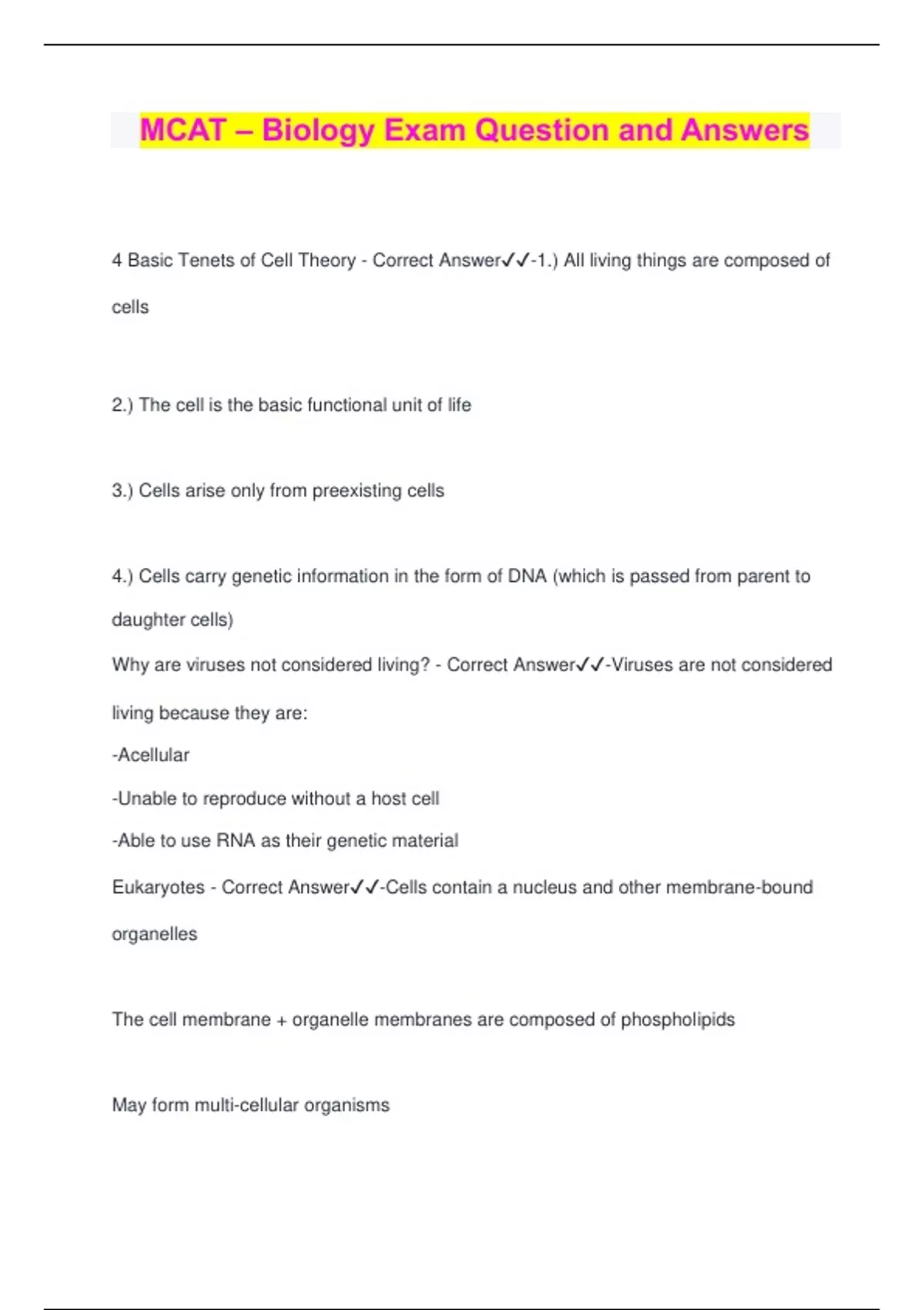 MCAT – Biology Exam Question and Answers 4 Basic Tenets of Cell Theory - Correct Answer️️ -1.) All living things are composed of cells 2.) The cell is the basic functional unit of life 3.) Cells arise only from preexisting cells 4.) Cells carry genetic information in the form of DNA (which is passed from parent to daughter cells) Why are viruses not considered living? - Correct Answer️️ -Viruses are not considered living because they are: -Acellular -Unable to reproduce without a host cell -Able to use RNA as their genetic material Eukaryotes - Correct Answer️️ -Cells contain a nucleus and other membrane-bound organelles The cell membrane + organelle membranes are composed of phospholipids May form multi-cellular organisms Cytosol - Correct Answer️️ -Suspends membrane-bound organelles in eukaryotes Allows for diffusion of molecules throughout the cell Why do eukaryotic cells have membrane-bound organelles? - Correct Answer️️ - Membrane-bound organelles allow for the compartmentalization of function. Why are cell membranes and organelle membranes composed of phospholipids? - Correct Answer️️ -Phospholipids create a hydrophilic surface, which electrostatically interacts with the aqueous environments inside and the outside of the cell. Hydrophobic inner portion provides a highly selective barrier between the interior of the cell + external environment Nucleus - Correct Answer️️ -Contains DNA organized into chromosomes Surrounded by nuclear membrane/envelope Nuclear membrane/envelope - Correct Answer️️ -A double membrane that surrounds the nucleus of a eukaryotic cell Separates the nuclear and cytosolic environments Contains nuclear pores -Facilitates selective material exchange between nucleus + cytosol Nucleolus - Correct Answer️️ -Darker-staining subsection of the nucleus Location of rRNA synthesis (produces ribosomes) Mitochondria - Correct Answer️️ -Semi-autonomous cellular organelles that contain some of their own genes, replicate independently of the nucleus via binary fission, and initiate apoptosis Outer membrane → separates mitochondrial + cytosolic environments Intermembrane space → located between inner + outer membranes Inner membrane → contains the molecules + enzymes of the ETC -Christae → convoluted structures that ↑ surface area available to ETC enzymes Matrix → space within the inner membrane Mitochondrial DNA - Correct Answer️️ -Circular molecules of DNA found outside of the nucleus in eukaryotic cells and replicate independently. Matrilineally inherited. Extranuclear inheritance (cytoplasmic inheritance) - Correct Answer️️ -Transmission of genetic material independent of the nucleus Ex. replication of mitochondria by binary fission Why are mitochondria considered to be semi-autonomous? - Correct Answer️️ -The mitochondria are considered semi-autonomous because they: -Contain some of their own genes -Replicate independently of the nucleus via binary fission -Initiate apoptosis by releasing ETC enzymes Lysosomes - Correct Answer️️ -Membrane-bound structures containing hydrolytic enzymes (endosomes) that break down substances ingested by endocytosis + cellular waste products Can initiate autolysis (apoptosis) by releasing its endosomes, which directly degrade cellular components. Endosomes - Correct Answer️️ -Transport materials to th
