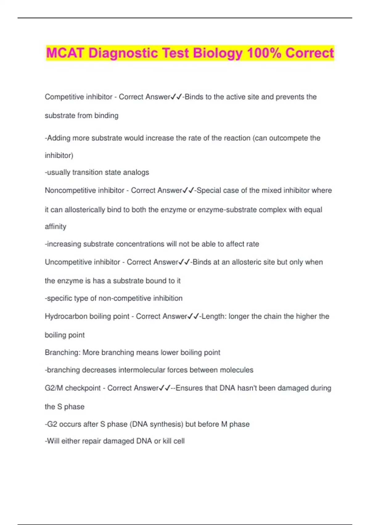 MCAT Diagnostic Test Biology 100% Correct Competitive inhibitor - Correct Answer️️ -Binds to the active site and prevents the substrate from binding -Adding more substrate would increase the rate of the reaction (can outcompete the inhibitor) -usually transition state analogs Noncompetitive inhibitor - Correct Answer️️ -Special case of the mixed inhibitor where it can allosterically bind to both the enzyme or enzyme-substrate complex with equal affinity -increasing substrate concentrations will not be able to affect rate Uncompetitive inhibitor - Correct Answer️️ -Binds at an allosteric site but only when the enzyme is has a substrate bound to it -specific type of non-competitive inhibition Hydrocarbon boiling point - Correct Answer️️ -Length: longer the chain the higher the boiling point Branching: More branching means lower boiling point -branching decreases intermolecular forces between molecules G2/M checkpoint - Correct Answer️️ --Ensures that DNA hasn't been damaged during the S phase -G2 occurs after S phase (DNA synthesis) but before M phase -Will either repair damaged DNA or kill cell Memory B-cells - Correct Answer️️ --Create antibodies for antigens already seen in the body -able to fight rapidly against a pathogen body has seen before Benzylmethylamine - Correct Answer️️ -Benzene ring with a methyl group and an amine group attached to it Benzylamine - Correct Answer️️ -Benzene ring with amine group attached (it can be attached via a carbon chain) Nitro - Correct Answer️️ -NO3 Amide - Correct Answer️️ -carbonyl and a N group Absorbed nutrients traveling to the lymphatic vessels (lacteals)