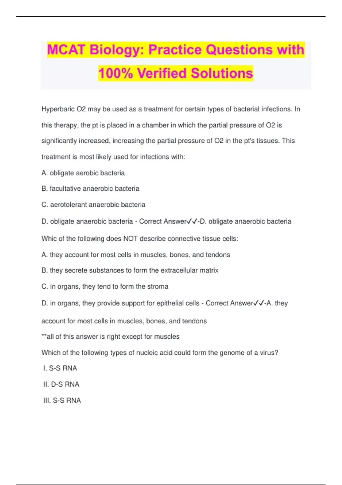 MCAT Biology: Practice Questions with 100% Verified Solutions Hyperbaric O2 may be used as a treatment for certain types of bacterial infections. In this therapy, the pt is placed in a chamber in which the partial pressure of O2 is significantly increased, increasing the partial pressure of O2 in the pt's tissues. This treatment is most likely used for infections with: A. obligate aerobic bacteria B. facultative anaerobic bacteria C. aerotolerant anaerobic bacteria D. obligate anaerobic bacteria - Correct Answer️️ -D. obligate anaerobic bacteria Whic of the following does NOT describe connective tissue cells: A. they account for most cells in muscles, bones, and tendons B. they secrete substances to form the extracellular matrix C. in organs, they tend to form the stroma D. in organs, they provide support for epithelial cells - Correct Answer️️ -A. they account for most cells in muscles, bones, and tendons **all of this answer is right except for muscles Which of the following types of nucleic acid could form the genome of a virus? I. S-S RNA II. D-S RNA III. S-S RNA A. I only B. II only C. I and II only D. I, II, and III - Correct Answer️️ -D. I, II, and III Which of the following activiites occurs in the Golgi apparatus? A. synthesis of proteins B. modification and distribution of proteins C. breakdown of lipids and carbs D. production of ATP - Correct Answer️️ -B. modification and distribution of proteins Mitochondrial DNA is: I. circular II. self replicating III. single stranded A. I only B. II only C. I and II only D. I, II, and III - Correct Answer️️ -C. I and II only Which of the following is NOT a function of the SER? A. lipid synthesis B. poison detoxification C. protein synthesis D. transport of proteins - Correct Answer️️ -C. protein synthesi