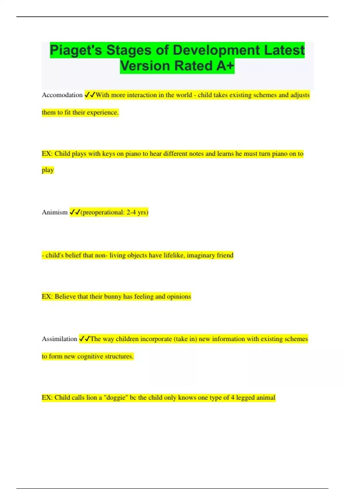 Piaget's Stages of Development Latest Version Rated A+ Accomodation With more interaction in the world - child takes existing schemes and adjusts them to fit their experience. EX: Child plays with keys on piano to hear different notes and learns he must turn piano on to play Animism (preoperational: 2-4 yrs) - child's belief that non- living objects have lifelike, imaginary friend EX: Believe that their bunny has feeling and opinions Assimilation The way children incorporate (take in) new information with existing schemes to form new cognitive structures. EX: Child calls lion a "doggie" bc the child only knows one type of 4 legged animal causal reasoning "causality" (preoperational) Cannot think logically about cause and effect - thoughts can cause actions. It changes over time: 1. by appearance 2. by all-powerful force 3. by causes in nature 4. approaches in adult explanation Centeration (preoperational) Focus on one piece of information at one time and ignoring others. EX: focus on swinging Concrete Operations Age: 7-11 (Middle Childhood - Elementary) - Classification skill (classify and divide objects