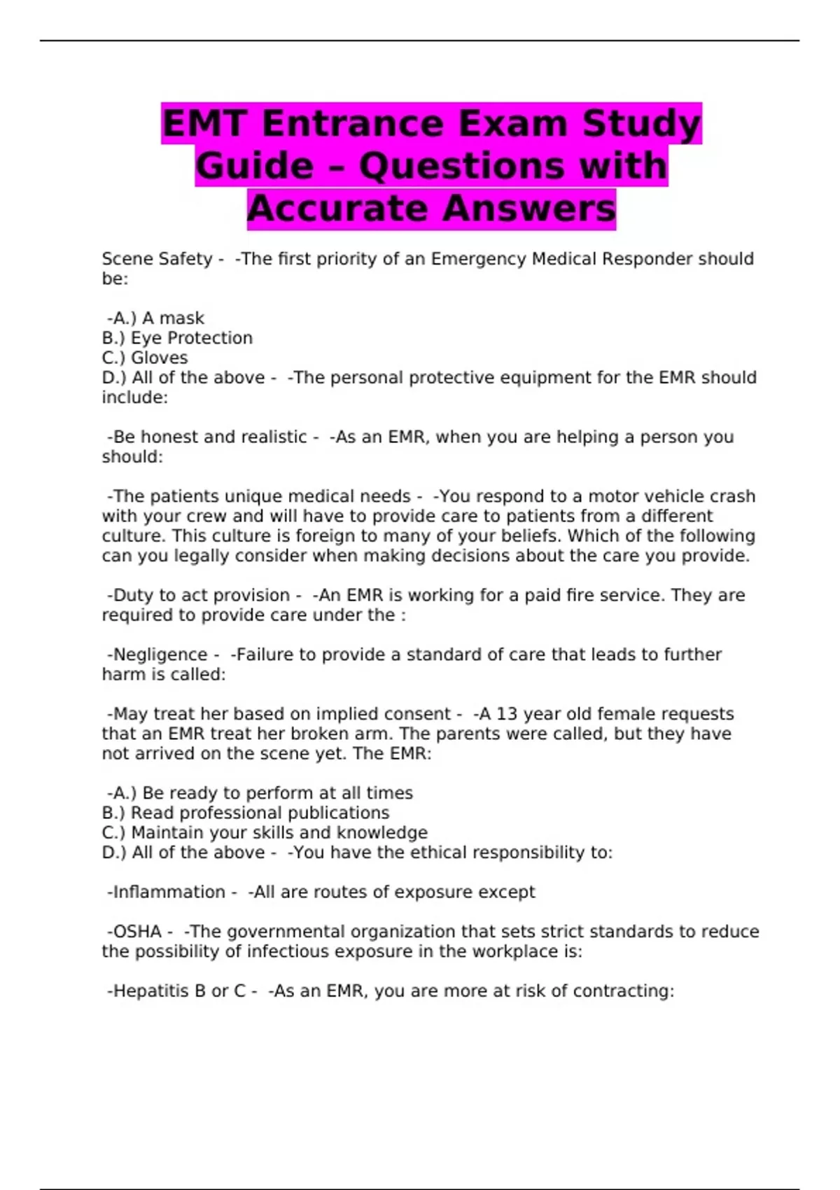 EMT Entrance Exam Study Guide – Questions with Accurate Answers