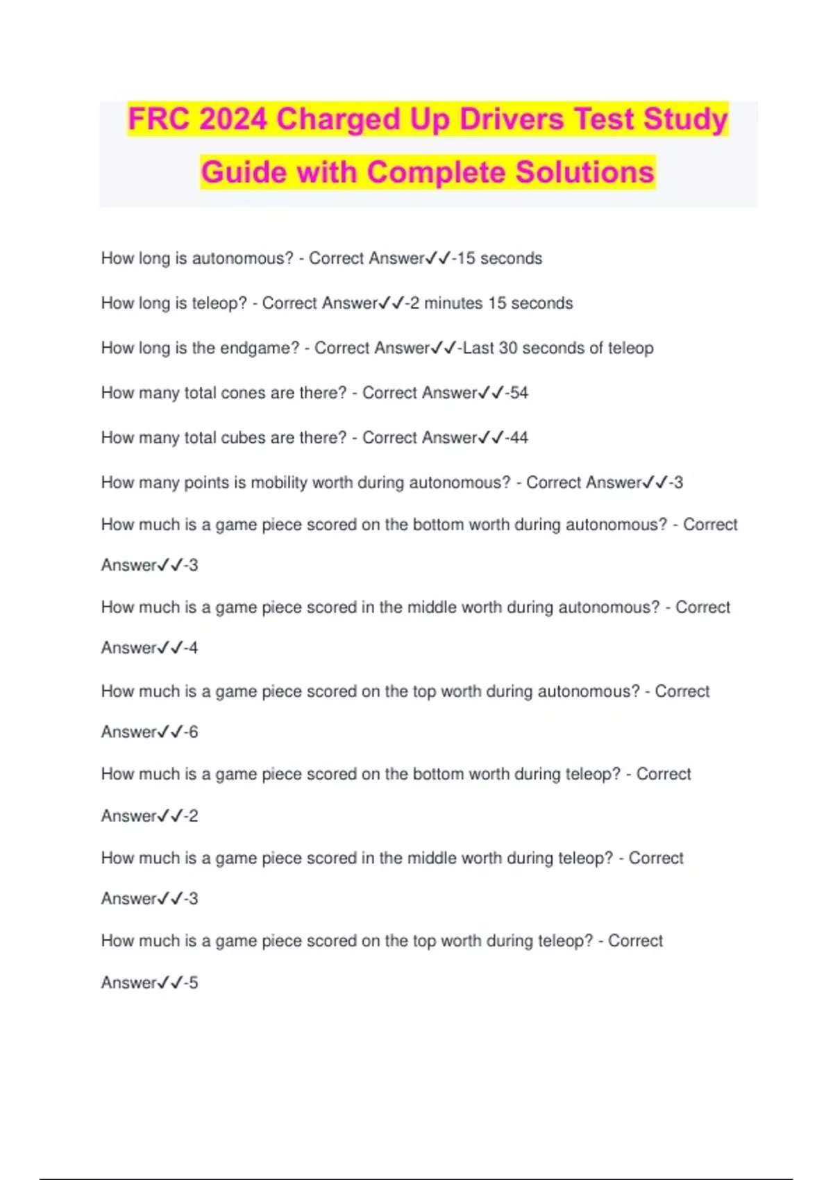 FRC 2024 Charged Up Drivers Test Study Guide with Complete Solutions How long is autonomous? - Correct Answer️️ -15 seconds How long is teleop? - Correct Answer️️ -2 minutes 15 seconds How long is the endgame? - Correct Answer️️ -Last 30 seconds of teleop How many total cones are there? - Correct Answer️️ -54 How many total cubes are there? - Correct Answer️️ -44 How many points is mobility worth during autonomous? - Correct Answer️️ -3 How much is a game piece scored on the bottom worth during autonomous? - Correct Answer️️ -3 How much is a game piece scored in the middle worth during autonomous? - Correct Answer️️ -4 How much is a game piece scored on the top worth during autonomous? - Correct Answer️️ -6 How much is a game piece scored on the bottom worth during teleop? - Correct Answer️️ -2 How much is a game piece scored in the middle worth during teleop? - Correct Answer️️ -3 How much is a game piece scored on the top worth during teleop? - Correct Answer️️ -5