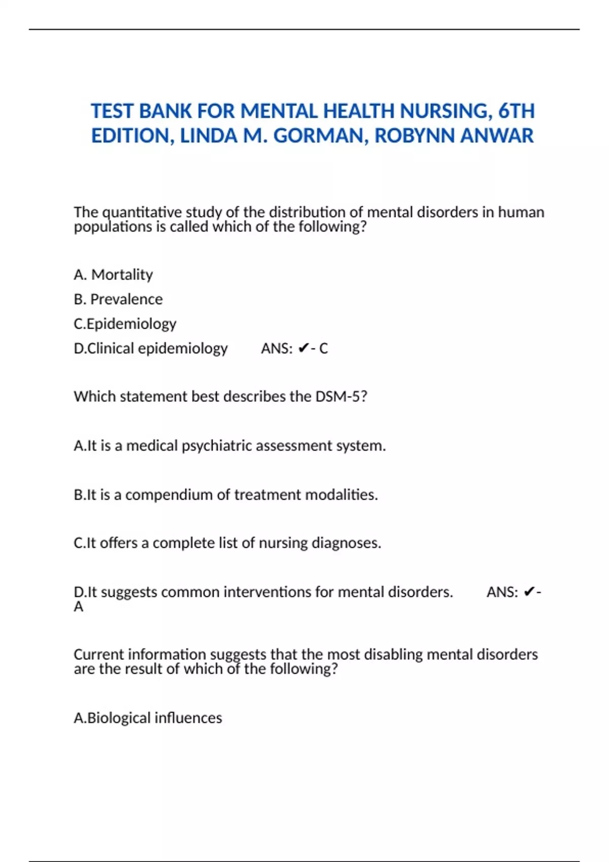 TEST BANK FOR MENTAL HEALTH NURSING, 6TH EDITION, LINDA M. GORMAN, ROBYNN ANWAR