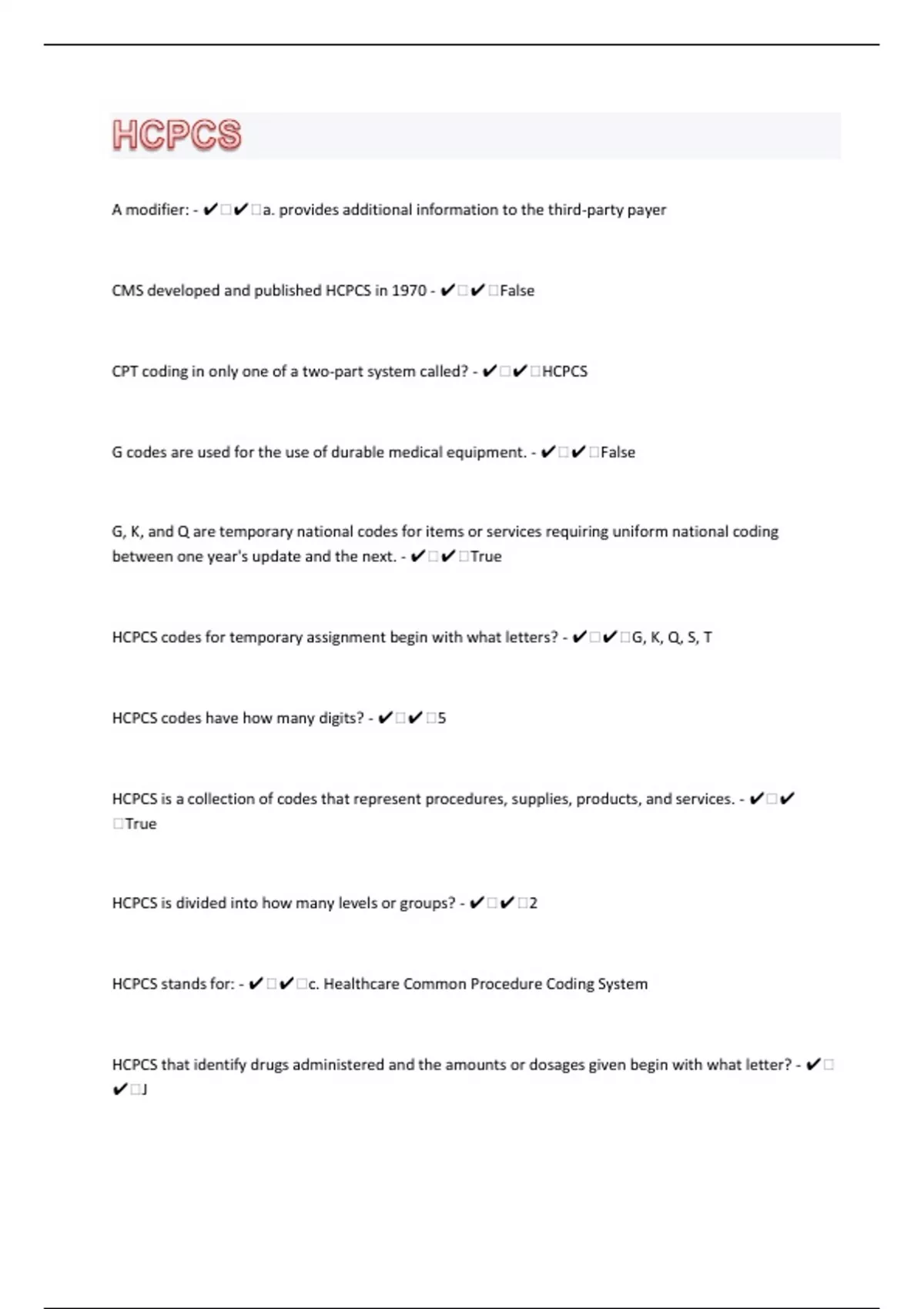 A modifier: - ️️a. provides additional information to the third-party payer CMS developed and published HCPCS in 1970 - ️️False CPT coding in only one of a two-part system called? - ️️HCPCS G codes are used for the use of durable medical equipment. - ️️False G, K, and Q are temporary national codes for items or services requiring uniform national coding between one year's update and the next. - ️️True HCPCS codes for temporary assignment begin with what letters? - ️️G, K, Q, S, T HCPCS codes have how many digits? - ️️5 HCPCS is a collection of codes that represent procedures, supplies, products, and services. - ️️True HCPCS is divided into how many levels or groups? - ️️2 HCPCS stands for: - ️️c. Healthcare Common Procedure Coding System HCPCS that identify drugs administered and the amounts or dosages given begin with what letter? - ️️J