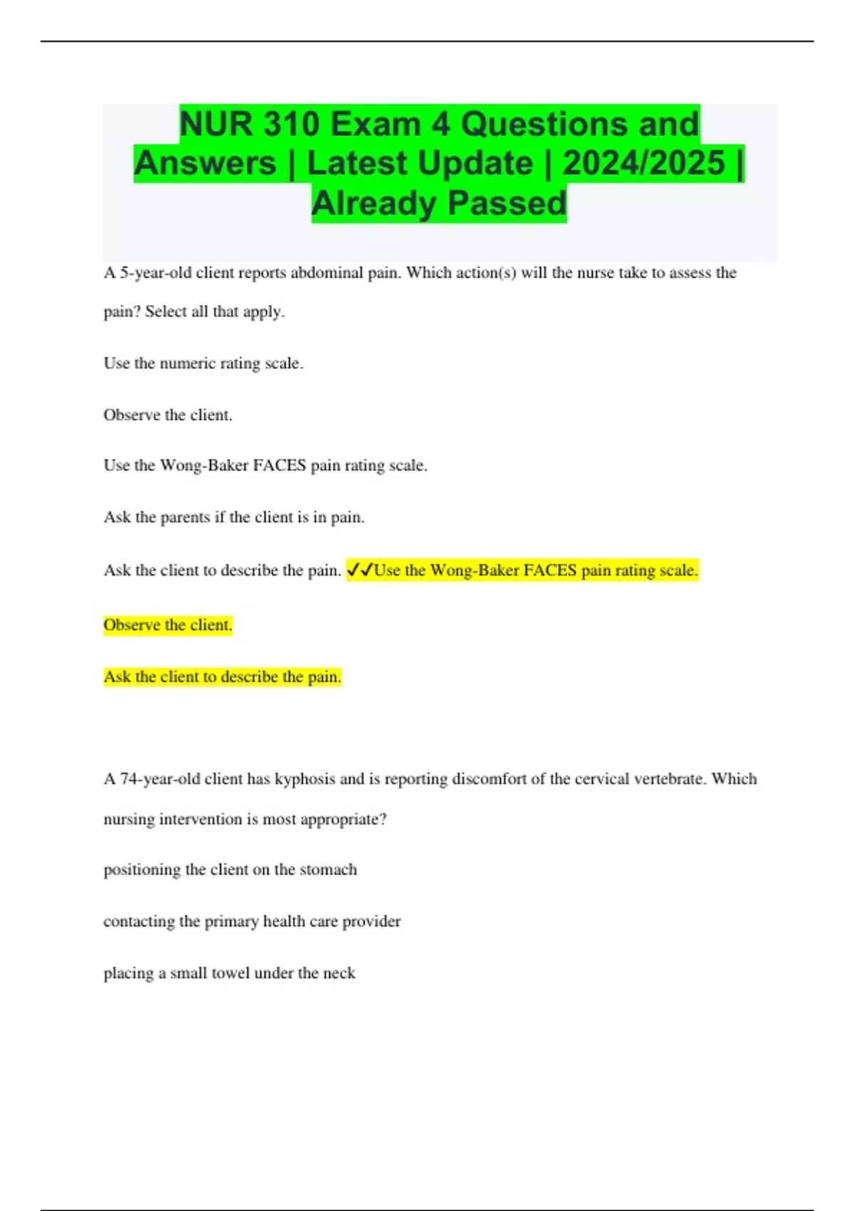 NUR 310 Exam 4 Questions and Answers | Latest Update | 2024/2025 | Already Passed A 5-year-old client reports abdominal pain. Which action(s) will the nurse take to assess the pain? Select all that apply. Use the numeric rating scale. Observe the client. Use the Wong-Baker FACES pain rating scale. Ask the parents if the client is in pain. Ask the client to describe the pain. Use the Wong-Baker FACES pain rating scale. Observe the client. Ask the client to describe the pain. A 74-year-old client has kyphosis and is reporting discomfort of the cervical vertebrate. Which nursing intervention is most appropriate? positioning the client on the stomach contacting the primary health care provider placing a small towel under the neck administering a muscle relaxer contacting the primary health care provider A client asks what trochanter rolls are used for when providing client care. What is the appropriate nursing response? "To avoid contractures." "To prevent foot drop." "To preserve your functional ability to grasp and pick up objects." "To prevent your legs from rotating outward." "To prevent your legs from rotating outward." A client calls a sleep clinic helpline and describes the spouse's sleep patterns of snoring loudly then becoming startled and waking up five or six times a night. The client is asking how to improve the spouse's sleep patterns. Which Information will the nurse include in teaching about healthy sleep patterns? Limit food intake before bed. The spouse's sleeping pattern seems normal. Discuss the sleep pattern with the health care provider. Sleep in another room to limit your disruption of the spouse's sleep. Discuss the sleep pattern with the health care provider. A client comes to the clinic and states to the nurse, "I am traveling overseas for a project frequently and am having a difficult time adjusting because of jet lag. What is the best response by the nurse? "Try to stay awake for the duration of the flight and sleep when you arrive." "You should take sleeping pills when you board so that you will sleep until you arrive at your destination. "If you have jet lag once, you shouldn't have any further problems on your next trip overseas." "Light therapy can be beneficial and help ease the transition to a new time schedule or zone." "Light therapy can be beneficial and help ease the transition to a new time schedule or zone." A client comes to the facility reporting acute pain. When assessing the client, the nurse understands that moderate, superficial acute pain can