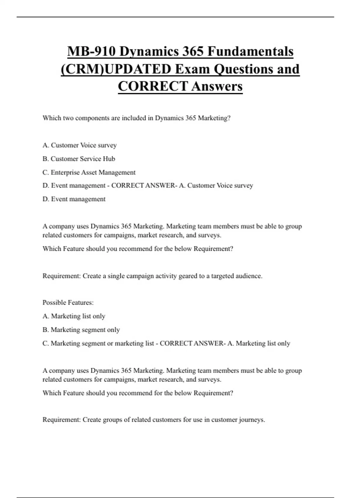 MB-910 Dynamics 365 Fundamentals (CRM)UPDATED Exam Questions and CORRECT Answers Which two components are included in Dynamics 365 Marketing? A. Customer Voice survey B. Customer Service Hub C. Enterprise Asset Management D. Event management - CORRECT ANSWER- A. Customer Voice survey D. Event management