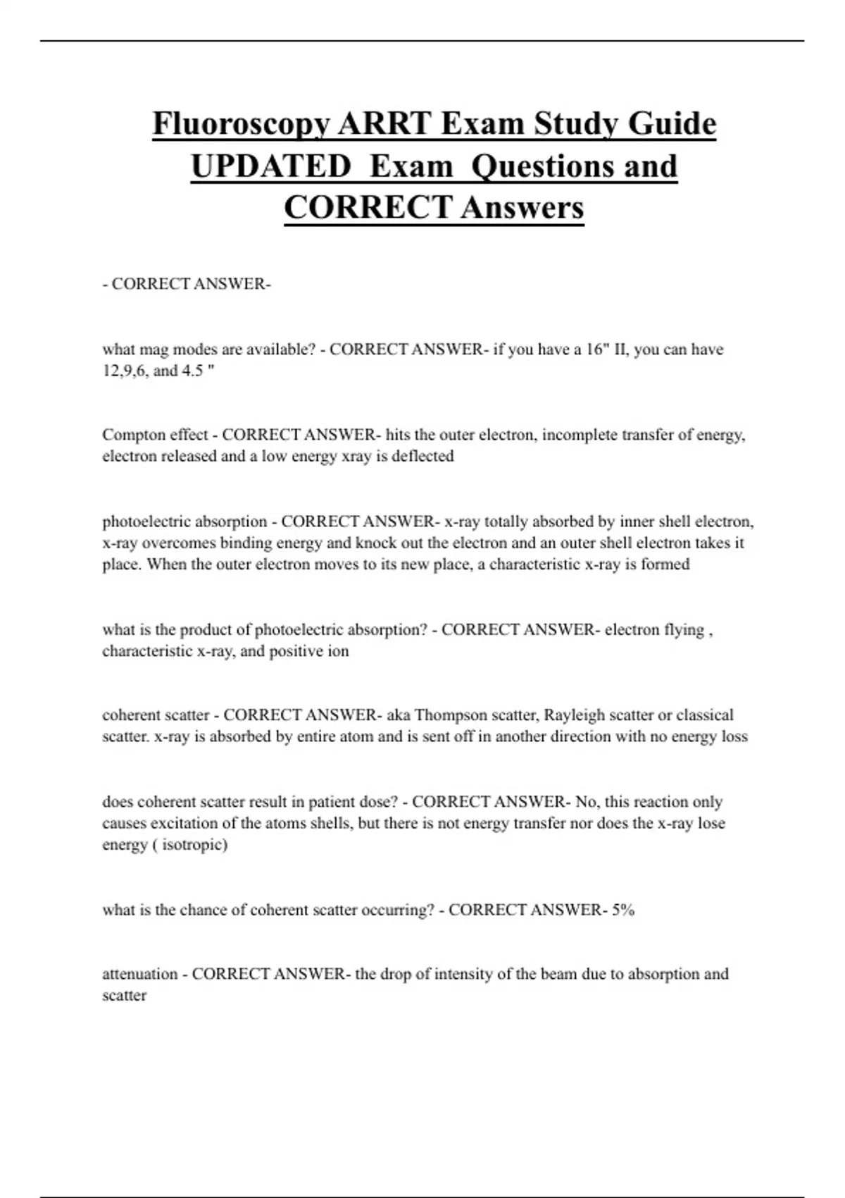 Fluoroscopy ARRT Exam Study Guide UPDATED Exam Questions and CORRECT Answers - CORRECT ANSWERwhat mag modes are available? - CORRECT ANSWER- if you have a 16" II, you can have 12,9,6, and 4.5 " Compton effect - CORRECT ANSWER- hits the outer electron, incomplete transfer of energy, electron released and a low energy xray is deflected photoelectric absorption - CORRECT ANSWER- x-ray totally absorbed by inner shell electron, x-ray overcomes binding energy and knock out the electron and an outer shell electron takes it place. When the outer electron moves to its new place, a characteristic x-ray is formed