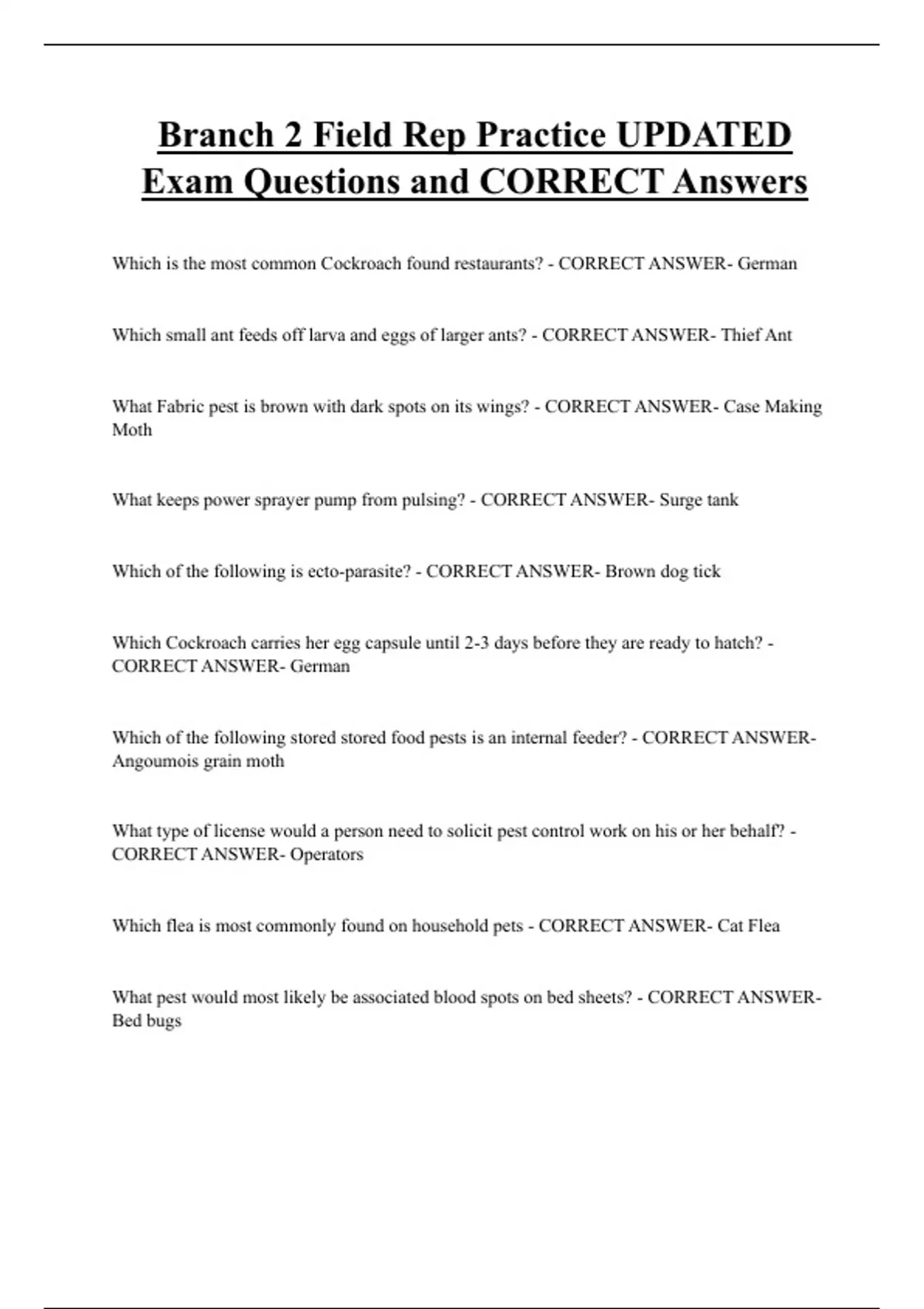 Branch 2 Field Rep Practice UPDATED Exam Questions and CORRECT Answers Which is the most common Cockroach found restaurants? - CORRECT ANSWER- German Which small ant feeds off larva and eggs of larger ants? - CORRECT ANSWER- Thief Ant What Fabric pest is brown with dark spots on its wings? - CORRECT ANSWER- Case Making Moth What keeps power sprayer pump from pulsing? - CORRECT ANSWER- Surge tank Which of the following is ecto-parasite? - CORRECT ANSWER- Brown dog tick