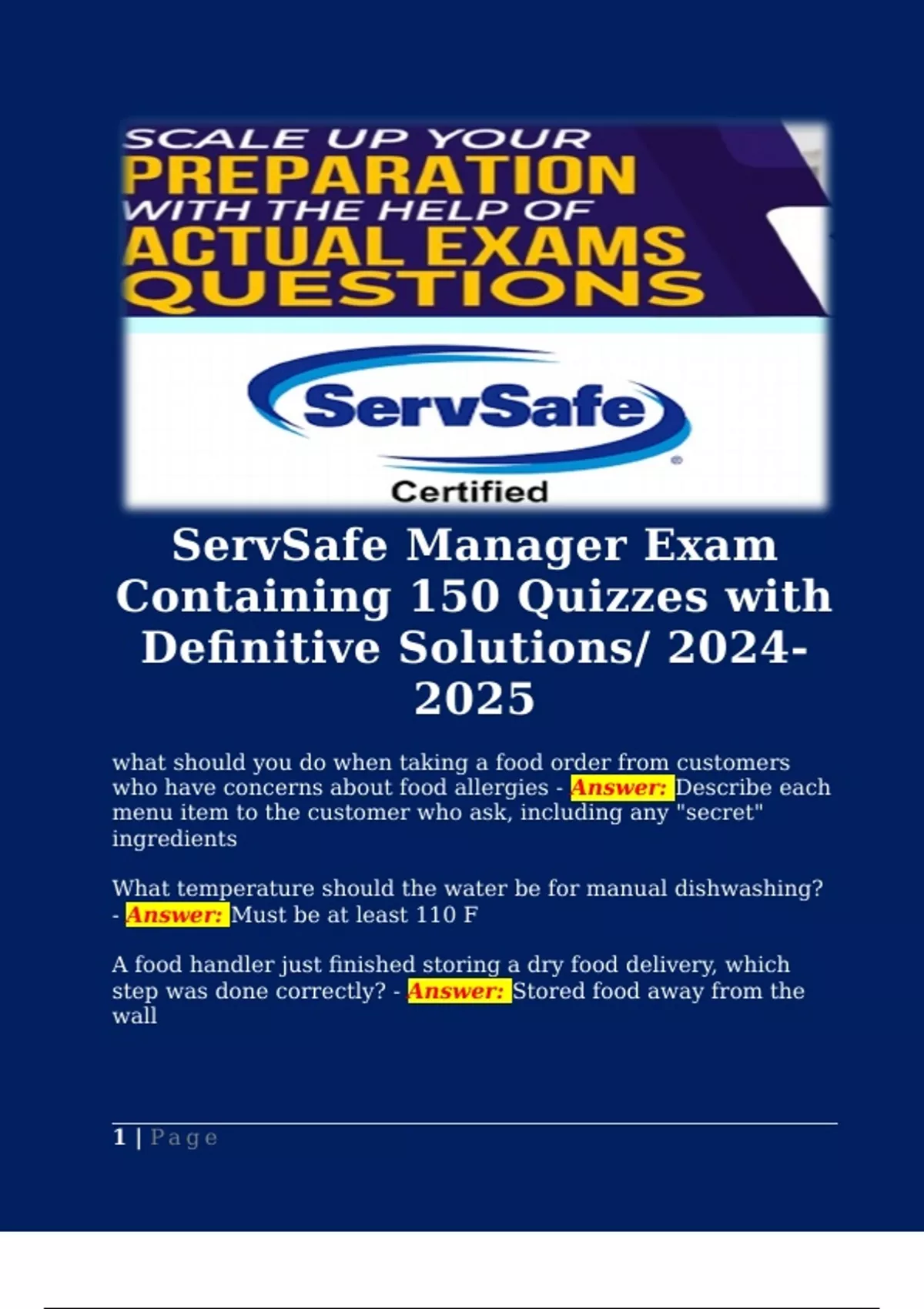 ServSafe Manager Exam Containing 150 Quizzes with Definitive Solutions/ . Terms like: what should you do when taking a food order from customers who have concerns about food allergies - Answer: Describe each menu item to the customer who ask, including any "secret" ingredients What temperature should the water be for manual dishwashing? - Answer: Must be at least 110 F