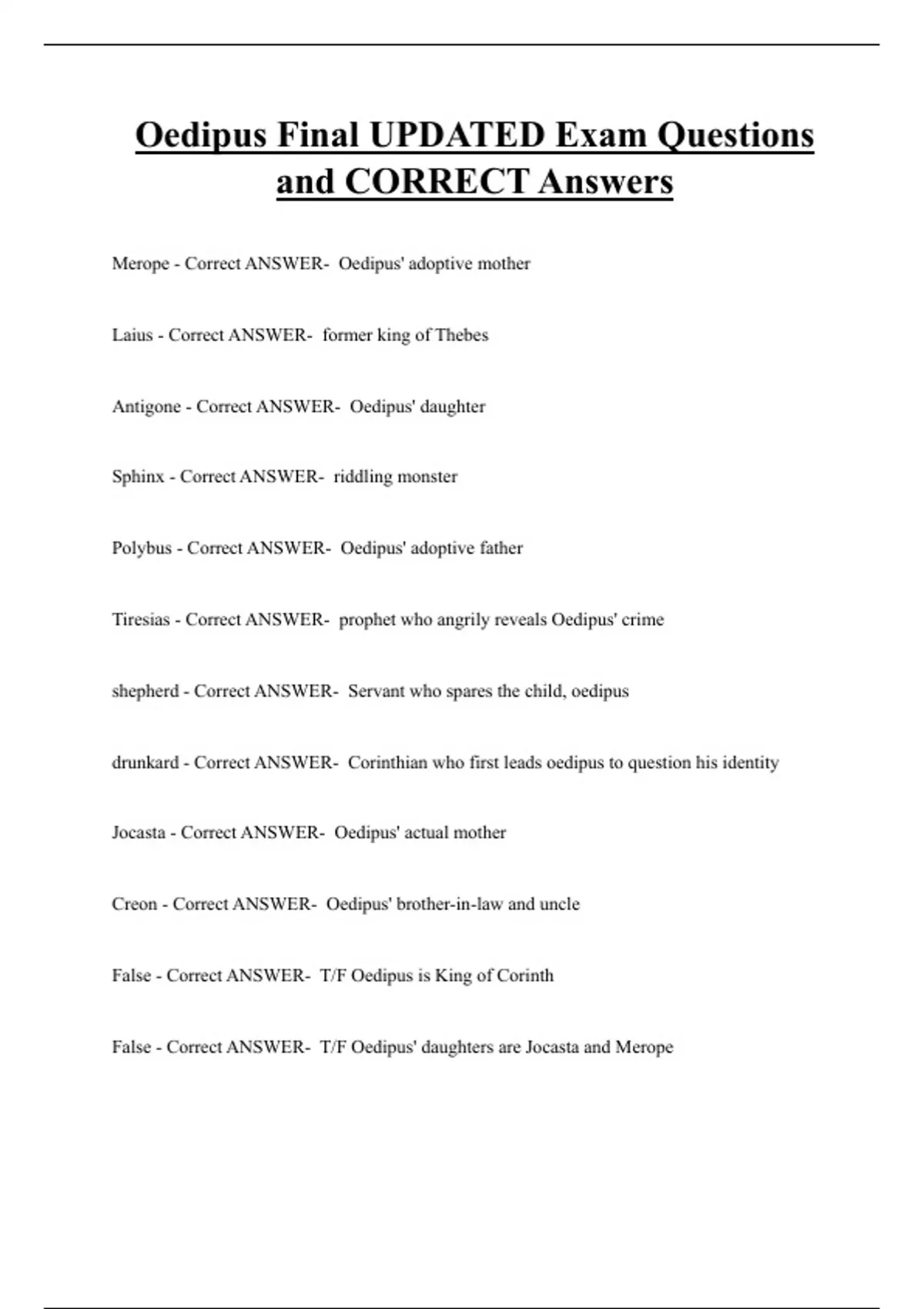 Oedipus Final UPDATED Exam Questions and CORRECT Answers Merope - Correct ANSWER- Oedipus' adoptive mother Laius - Correct ANSWER- former king of Thebes Antigone - Correct ANSWER- Oedipus' daughter Sphinx - Correct ANSWER- riddling monster Polybus - Correct ANSWER- Oedipus' adoptive father Tiresias - Correct ANSWER- prophet who angrily reveals Oedipus' crime