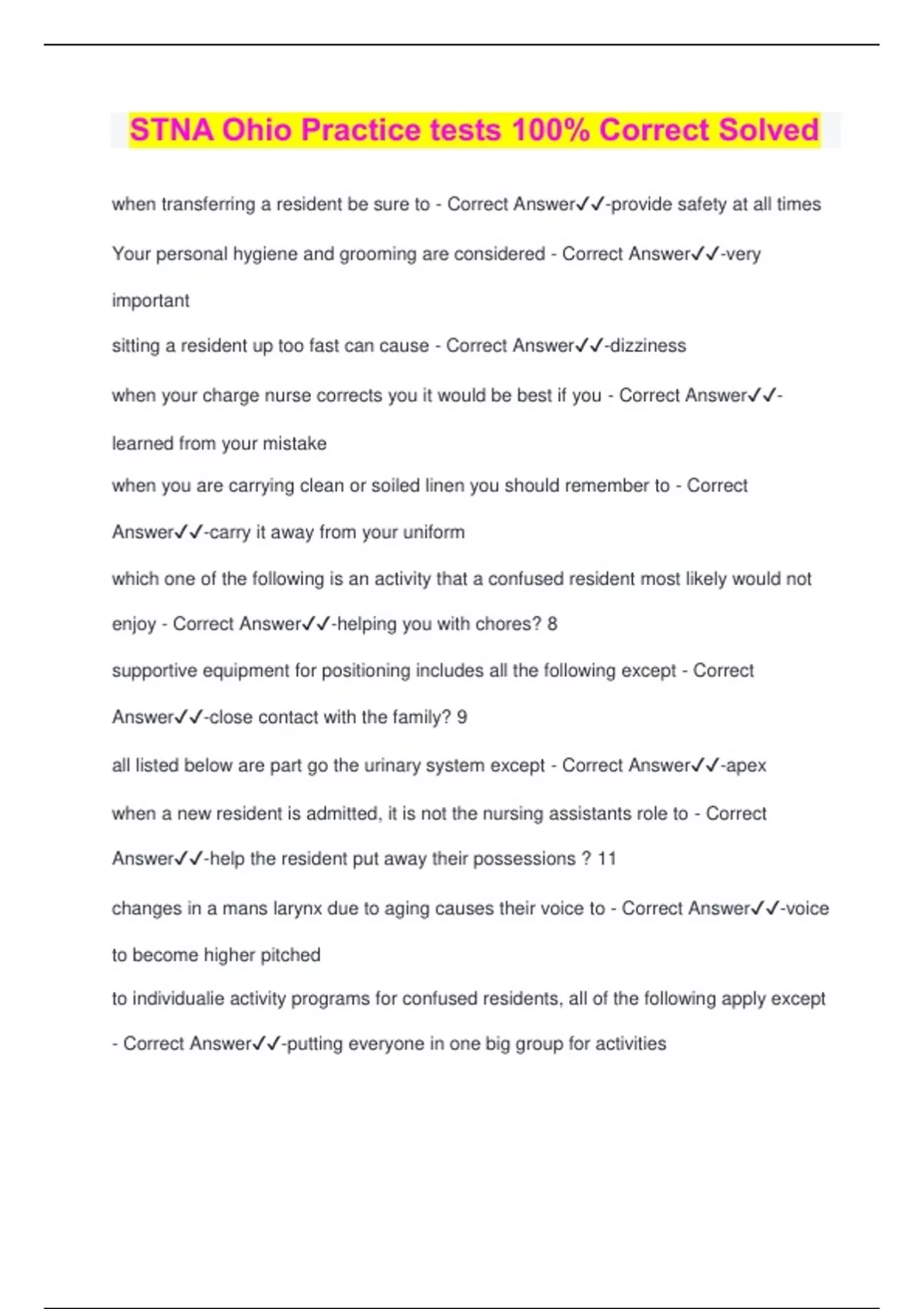 STNA Ohio Practice tests 100% Correct Solved when transferring a resident be sure to - Correct Answer️️ -provide safety at all times Your personal hygiene and grooming are considered - Correct Answer️️ -very important sitting a resident up too fast can cause - Correct Answer️️ -dizziness when your charge nurse corrects you it would be best if you - Correct Answer️️ - learned from your mistake when you are carrying clean or soiled linen you should remember to - Correct Answer️️ -carry it away from your uniform which one of the following is an activity that a confused resident most likely would not enjoy - Correct Answer️️ -helping you with chores? 8 supportive equipment for positioning includes all the following except - Correct Answer️️ -close contact with the family? 9 all listed below are part go the urinary system except - Correct Answer️️ -apex when a new resident is admitted, it is not the nursing assistants role to - Correct Answer️️ -help the resident put away their possessions ? 11 changes in a mans larynx due to aging causes their voice to - Correct Answer️️ -voice to become higher pitched to individualie activity programs for confused residents, all of the following apply except - Correct Answer️️ -putting everyone in one big group for activities