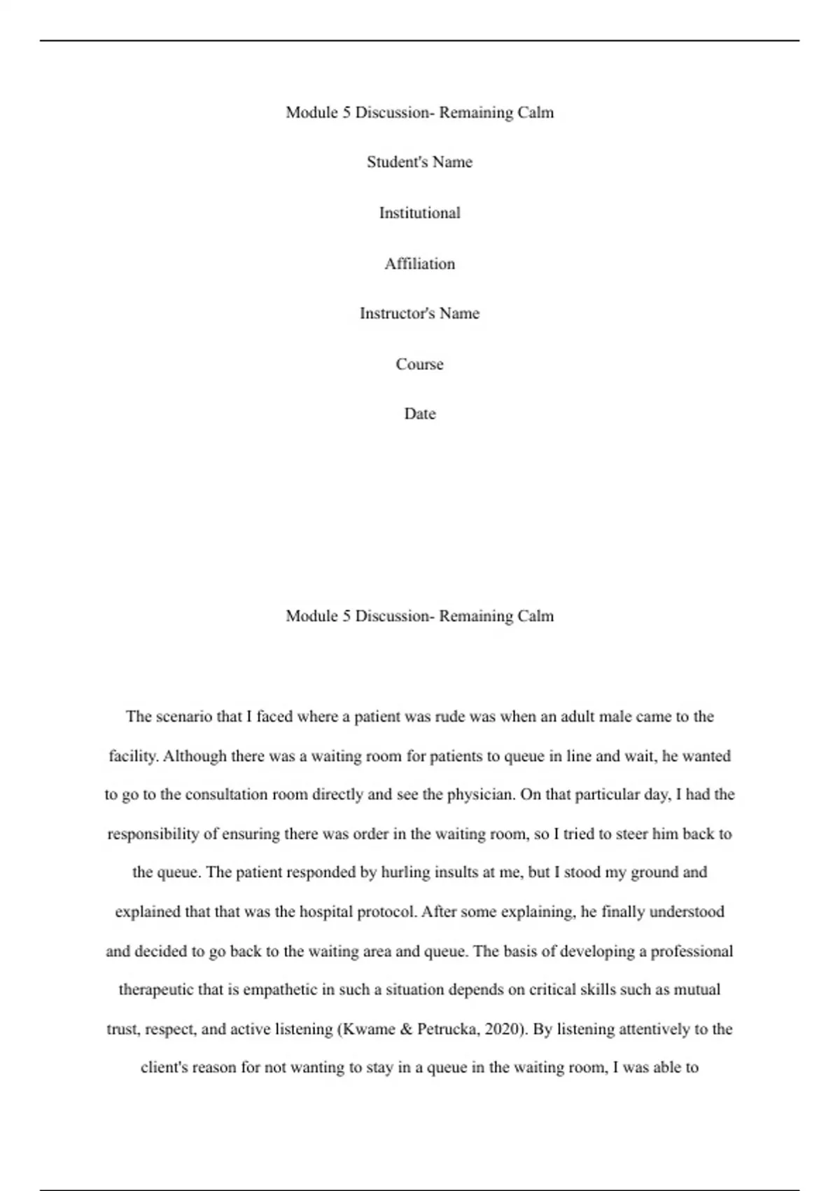 NRNP 6645 Module 5 DiscussionModule 5 Discussion- Remaining CalmStudent's NameInstitutionalAffiliationInstructor's NameCourseDateModule 5 Discussion- Remaining Calm The scenario that I faced where a patient was rude was when an adult male came to the facility. Although there was a waiting room for patients to queue in line and wait, he wanted to go to the consultation room directly and see the physician. On that particular day, I had the responsibility of ensuring there was order in the waiting room, so I tried to steer him back to the queue. The patient responded by hurling insults at me, but I stood my ground and explained that that was the hospital protocol. After some explaining, he finally understood and decided to go back to the waiting area and queue. The basis of developing a professional therapeutic that is empathetic in such a situation depends on critical skills such as mutual trust, respect, and active listening (Kwame & Petrucka, 2020). By listening attentively to the client's reason for not wanting t