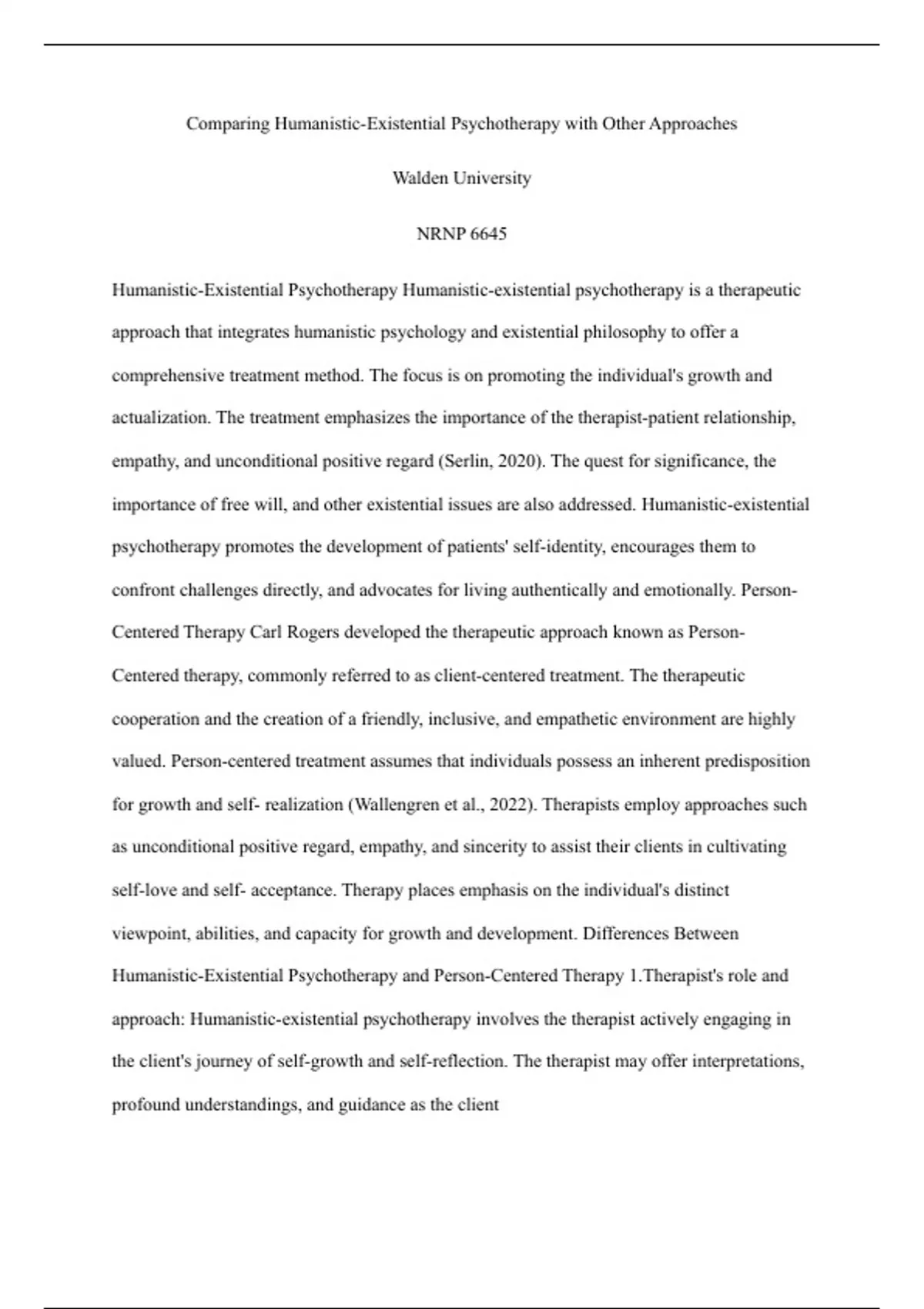 NRNP 6645 Comparing HumanisticComparing Humanistic-Existential Psychotherapy with Other ApproachesWalden UniversityNRNP 6645Humanistic-Existential Psychotherapy Humanistic-existential psychotherapy is a therapeutic approach that integrates humanistic psychology and existential philosophy to offer a comprehensive treatment method. The focus is on promoting the individual's growth and actualization. The treatment emphasizes the importance of the therapist-patient relationship, empathy, and unconditional positive regard (Serlin, 2020). The quest for significance, the importance of free will, and other existential issues are also addressed. Humanistic-existential psychotherapy promotes the development of patients' self-identity, encourages them to confront challenges directly, and advocates for living authentically and emotionally. Person-Centered Therapy Carl Rogers developed the therapeutic approach known as Person-Centered therapy, commonly referred to as client-centered treatment. The therapeutic cooperation and th
