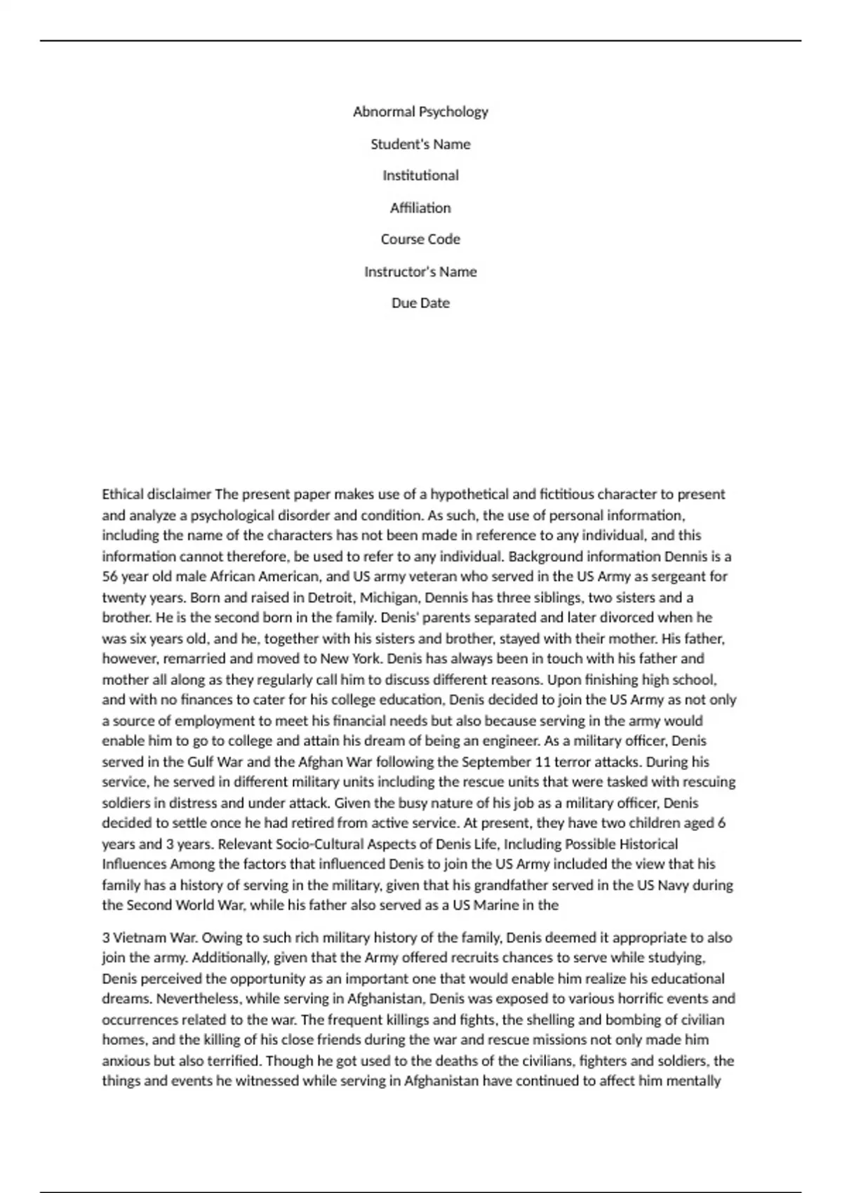 NRNP 6568 Abnormal PsychologyAbnormal PsychologyStudent's NameInstitutionalAffiliationCourse CodeInstructor's NameDue DateEthical disclaimer The present paper makes use of a hypothetical and fictitious character to present and analyze a psychological disorder and condition. As such, the use of personal information, including the name of the characters has not been made in reference to any individual, and this information cannot therefore, be used to refer to any individual. Background information Dennis is a 56 year old male African American, and US army veteran who served in the US Army as sergeant for twenty years. Born and raised in Detroit, Michigan, Dennis has three siblings, two sisters and a brother. He is the second born in the family. Denis' parents separated and later divorced when he was six years old, and he, together with his sisters and brother, stayed with their mother. His father, however, remarried and moved to New York. Denis has always been in touch with his father and mother all along as they r