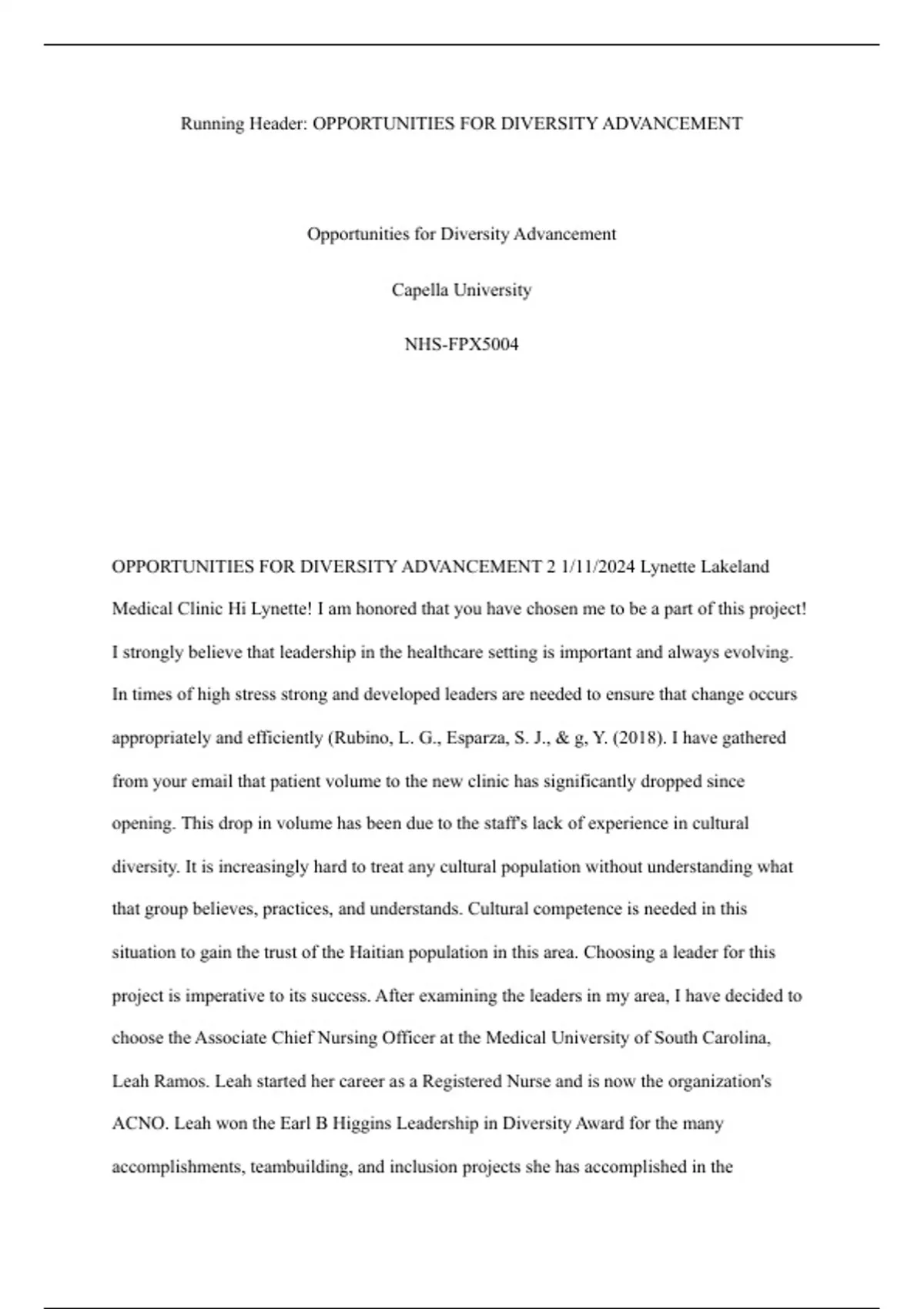 NHS-FPX5004 Running HeaderRunning Header: OPPORTUNITIES FOR DIVERSITY ADVANCEMENTOpportunities for Diversity AdvancementCapella UniversityNHS-FPX5004OPPORTUNITIES FOR DIVERSITY ADVANCEMENT 2 1/11/2024 Lynette Lakeland Medical Clinic Hi Lynette! I am honored that you have chosen me to be a part of this project! I strongly believe that leadership in the healthcare setting is important and always evolving. In times of high stress strong and developed leaders are needed to ensure that change occurs appropriately and efficiently (Rubino, L. G., Esparza, S. J., & g, Y. (2018). I have gathered from your email that patient volume to the new clinic has significantly dropped since opening. This drop in volume has been due to the staff's lack of experience in cultural diversity. It is increasingly hard to treat any cultural population without understanding what that group believes, practices, and understands. Cultural competence is needed in this situation to gain the trust of the Haitian population in this area. Choosing