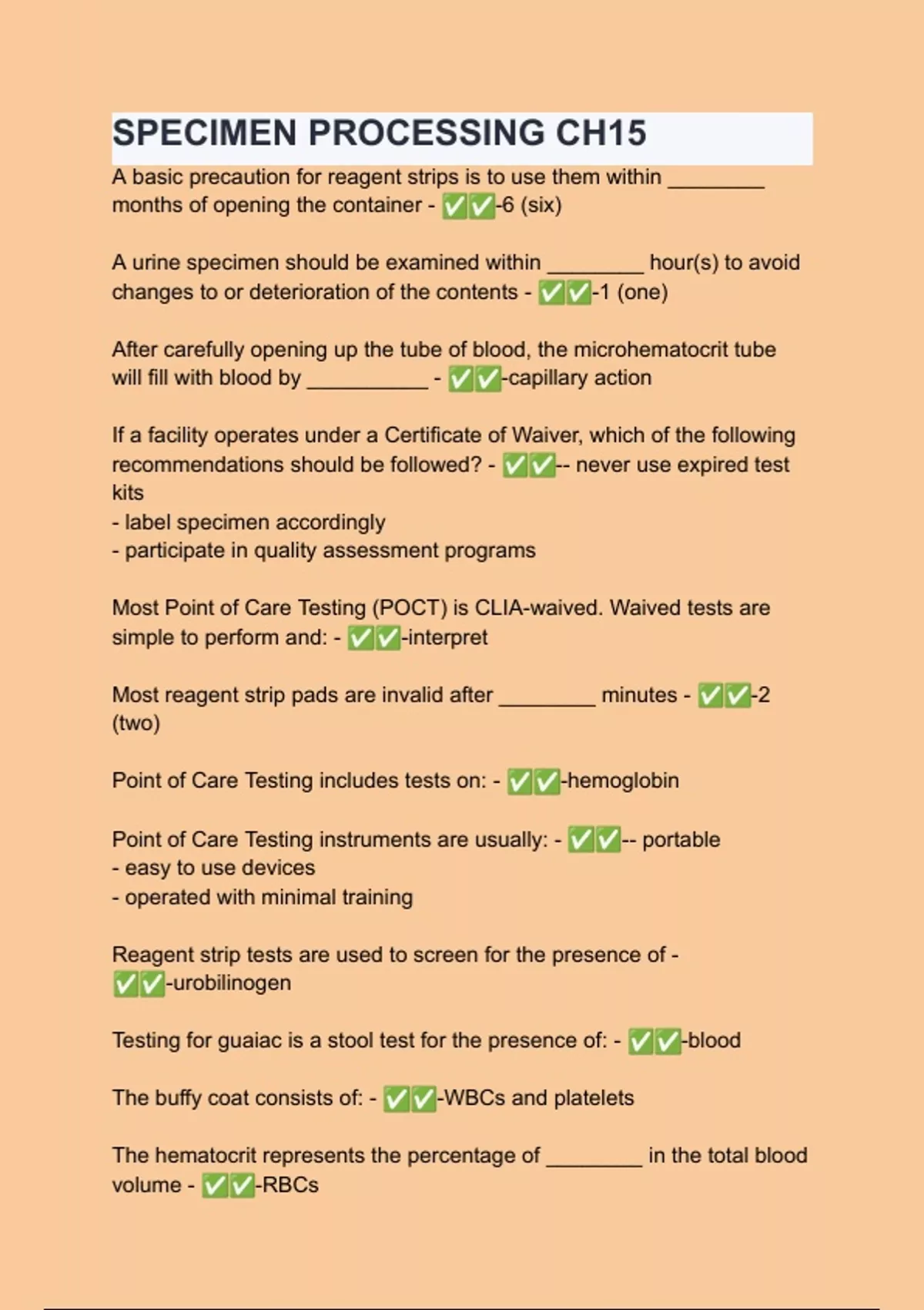 SPECIMEN PROCESSING CH15 Questions with verified correct answers - complete solution 2024