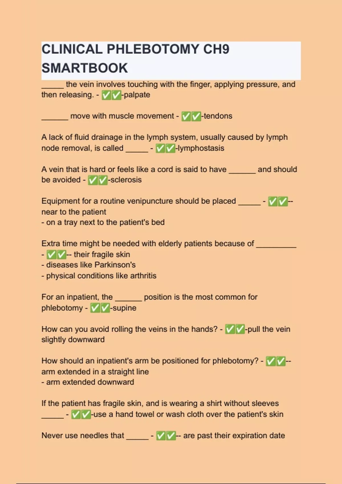 CLINICAL PHLEBOTOMY CH9 SMARTBOOK Questions with verified correct answers - complete