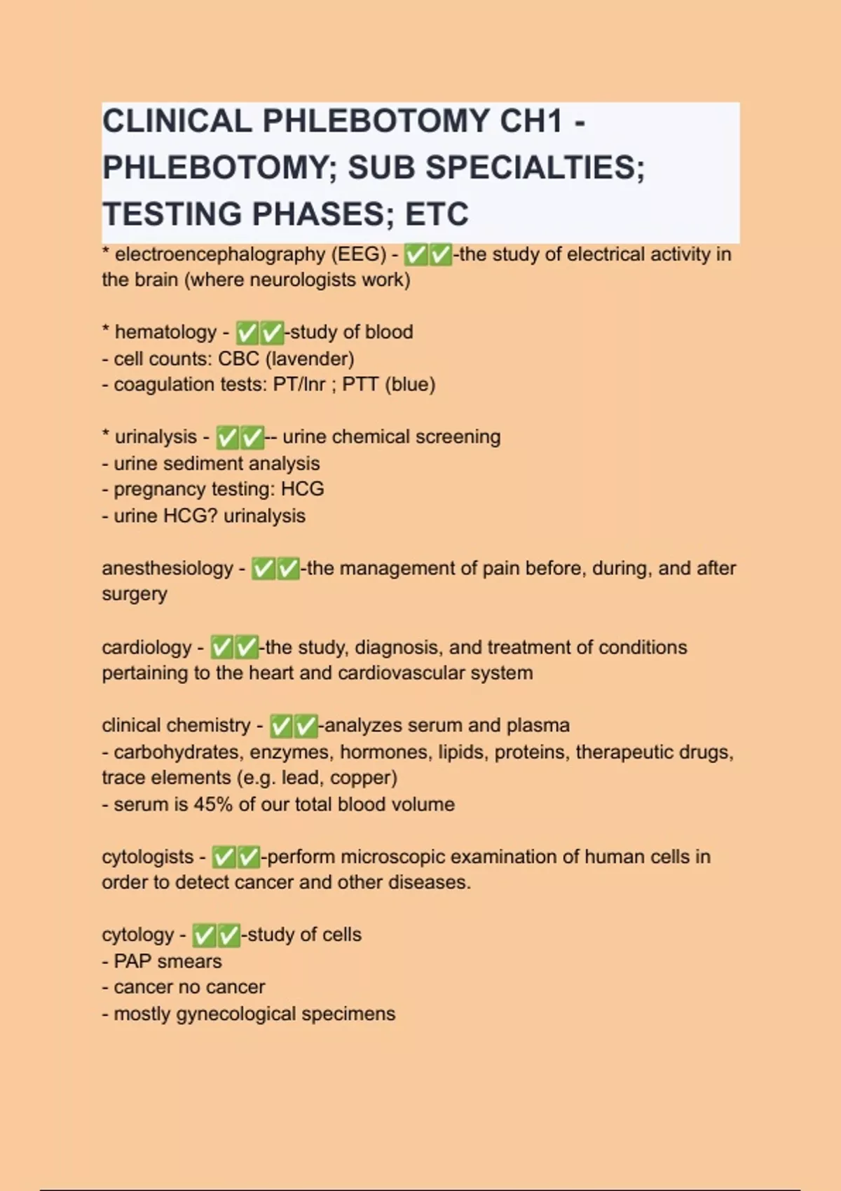 CLINICAL PHLEBOTOMY CH1 - PHLEBOTOMY; SUB SPECIALTIES; TESTING PHASES; ETC Questions