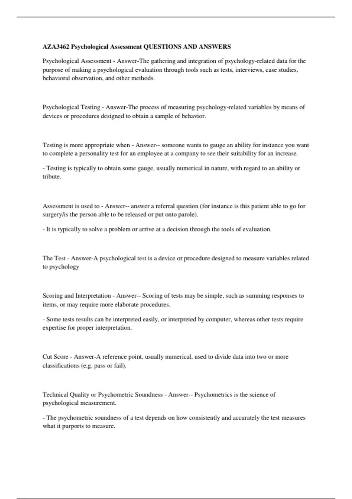 AZA3462 Psychological Assessment QUESTIONS AND ANSWERS