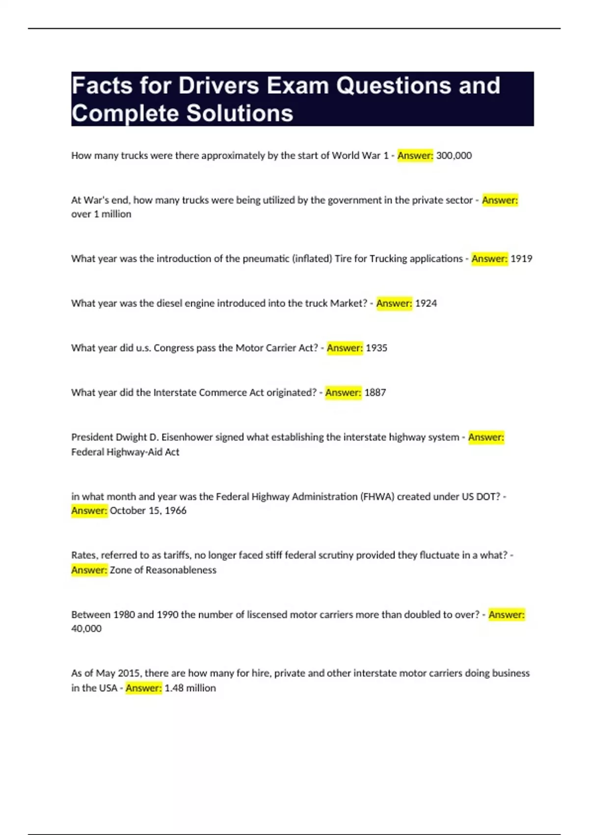 Facts for Drivers Exam Questions and Complete Solutions How many trucks were there approximately by the start of World War 1 - Answer: 300,000 At War's end, how many trucks were being utilized by the government in the private sector - Answer: over 1 million What year was the introduction of the pneumatic (inflated) Tire for Trucking applications - Answer: 1919 What year was the diesel engine introduced into the truck Market? - Answer: 1924 What year did u.s. Congress pass the Motor Carrier Act? - Answer: 1935 What year did the Interstate Commerce Act originated? - Answer: 1887 President Dwight D. Eisenhower signed what establishing the interstate highway system - Answer: Federal Highway-Aid Act in what month and year was the Federal Highway Administration (FHWA) created under US DOT? - Answer: October 15, 1966 Rates, referred to as tariffs, no longer faced stiff federal scrutiny provided they fluctuate in a what? - Answer: Zone of Reasonableness Between 1980 and 1990 the number of liscensed motor carriers more than doubled to over? - Answer: 40,000 As of May 2015, there are how many for hire, private and other interstate motor carriers doing business in the USA - Answer: 1.48 million How many trucks hauled more than 10.49 Billion tons of freight, representing 70.1% of total domestic tonnage? - Answer: 35.03 million What year did Congress pass the Motor Carrier Safety Act? - Answer: 1986 What year was the Interstate Commerce Commission formally abolished? - Answer: 1995 What is NAFTA stand for? - Answer: North American Free Trade Agreement When did NAFTA come into effect? - Answer: Jan 1, 1994 What Month Day Year did President Bill Clinton sign into law the Transportation Equity Act for the 21st Century ? - Answer: June 9, 1998 What provides over $105 Billion in funding for surface transportation programs for fiscal years? - Answer: Moving Ahead for Progress in the 21st Century Act What year was the ATA established? - Answer: 1933 What year was the Motor Carrier Act Part II signed into law? - Answer: 1935 What year was the First National Truck Rodeo? - Answer: 1937 What Year was the DOT established? - Answer: 1966 What year was the EPA established? - Answer: 1970 What year did the Motor Carrier Act deregulate the trucking industry? - Answer: 1980 Commercial Vehicle Safety Act established. America's Road team established. - Answer: 1986 What year was North American Free Trade Agreement ratified - Answer: 1994 What year did the Federal Law limit states authority to regulate the interstate Trucking industry. - Answer: 1995 What is America's slogan for trucking? - Answer: Trucking Moves America Forward What percentage does the US communities rely exclusively on trucks to deliver their products in goods? - Answer: 80% Businesses choose trucks for nearly how many cents out of every dollar they spend on freight transportation? - Answer: 81 Where is the ATA Headquartered? - Answer: Arlington, Virginia When was the Aviation and Transportation Security Act signed into law by President George W Bush? - Answer: November 19, 2001 What does TWIC stand for? - Answer: Transportation Worker Identification Credentials What does the acronym NIOSH stand for? - Answer: National Institute for Occupational Safety & Health Once a driver obtains a CLP he or she must wait at least how many days before becoming eligible to take the road test required before a person is issued a CDL? - Answer: 14 Days As of May 2015, there are how many million for hire, private and other Interstate Motor carriers doing business in the United States? - Answer: 1.48 million What causes the most accidents? - Answer: Human error Commercial truck taxes average over how many dollars per vehicle annually - Answer: $16,000 According to the Mayo Clinic, when pneumonia occurs with an inflammation of the membranes around the lung, you may have considerable chest discomfort when inhaling or coughing. What is this condition called? - Answer: Pleurisy What class fire extinguisher is used for flammable liquids? - Answer: class B Upon arrival, what safety features should a driver look for a self-service fueling facility? - Answer: the emergency shutoff for the pumps What class fire extinguisher should be used for energized electrical equipment? - Answer: class c What is NAFTA? - Answer: The act eased trade restrictions by eliminating tariffs and reducing limitations on the movement of goods across North America's borders. The US and Mexico struggled to implement nafta's Trucking Provisions for 15 years costing us businesses and estimated what? - Answer: $2.4 billion The NAFTA Pilot officially ended when? - Answer: October 10, 2014 the transportation Equity act for the 21st century t-21 Act, when did President Clinton sign into law? - Answer: 1998 what is the FAST Act and when and who signed into law? - Answer: Obama in 2015. Provides funding for surface transportation and increases by 11% over the nextv5 years When was the FMCSA established? - Answer: 2000 Trucks carry what percentage of domestic freight tonnage? - Answer: 70.01% There are ________ million miles of roadways and streets. - Answer: 4.07 million ATA reports that the government defines large trucks as any vehicle with a gross weight rating greater than _______ pounds? - Answer: 10,000 How many truck drivers in the U.S.? - Answer: 3.5 million What percentage of the public have a positive view of CMV drivers? - Answer: 80% _____% of the public believe that truck drivers exceed the speed limit frequently. - Answer: 64% The actual speed of trucks is slower by ___ to ___ mph than the average speed of automobiles. - Answer: 2 to 5 what is the motto of the Americans Road Team? - Answer: Safety is our driving concern A Virginia Tech Study found that ___ of crashes were caused by passenger car drivers? - Answer: 78% What program isba joint initiative between the U.S, Mexico and Canada offering expedited clearance across the borders and their loads enrolled in C-TPAT - Answer: Free and Secure Tr