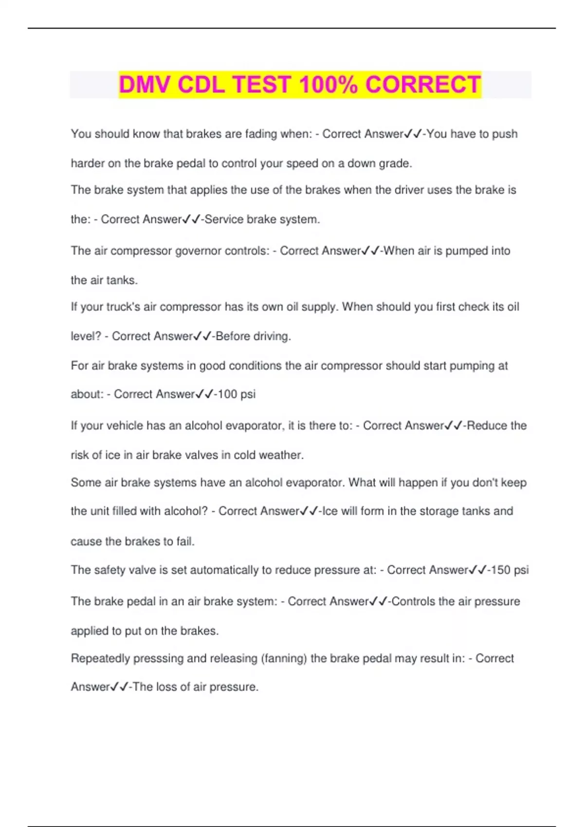 DMV CDL TEST 100% CORRECT You should know that brakes are fading when: - Correct Answer️️ -You have to push harder on the brake pedal to control your speed on a down grade. The brake system that applies the use of the brakes when the driver uses the brake is the: - Correct Answer️️ -Service brake system. The air compressor governor controls: - Correct Answer️️ -When air is pumped into the air tanks. If your truck's air compressor has its own oil supply. When should you first check its oil level? - Correct Answer️️ -Before driving. For air brake systems in good conditions the air compressor should start pumping at about: - Correct Answer️️ -100 psi If your vehicle has an alcohol evaporator, it is there to: - Correct Answer️️ -Reduce the risk of ice in air brake valves in cold weather. Some air brake systems have an alcohol evaporator. What will happen if you don't keep the unit filled with alcohol? - Correct Answer️️ -Ice will form in the storage tanks and cause the brakes to fail. The safety valve is set automatically to reduce pressure at: - Correct Answer️️ -150 psi The brake pedal in an air brake system: - Correct Answer️️ -Controls the air pressure applied to put on the brakes. Repeatedly presssing and releasing (fanning) the brake pedal may result in: - Correct Answer️️ -The loss of air pressure. The most common type of foundation brake found on heavy vehicle is the: - Correct Answer️️ -S-cam drum. S-cam: - Correct Answer️️ -Forces the brakes shoes against the inside of the brake drum. When the brakes are applied the brake shoes or linings are pressed against the: - Correct Answer️️ -Brake drums or disc. All air brake equipped vehicles have: - Correct Answer️️ -A supply pressure gauge. The application pressure gauge shows how much air pressure you: - Correct Answer️️ -Are applying to the brakes. Stop light switch: - Correct Answer️️ -Turns on the brake lights to warn drivers behind you. Under normal conditions in order to engage the parking brakes the driver must first: - Correct Answer️️ -Make sure the air brake system is fully pressurized. The braking power of the spring brakes: - Correct Answer️️ -Depends on the service brakes being in adjustment. The parking or emergency brake on trucks and buses can only be held by: - Correct Answer️️ -Spring pressure If the spring brakes are on you should push the brake pedal: - Correct Answer️️ - Never If your truck or bus has dual parking control valves, you can use pressure from a separate tank to: - Correct Answer️️ -Release the spring emergency/parking brakes to move a short distance. The driver must be able to see a warning before air pressure in the service air tanks falls below: - Correct Answer️️ -60 P.S.I. The most important thing to do when the low air warning comes on: - Correct Answer️️ -Stop and safely park as soon as possible. Your vehicle has a dual air brake system. If a low air pressure warning comes on for the secondary system; you should: - Correct Answer️️ -Bring the vehicle to a safe stop and continue only when the system is fixed. If your truck has a dual air system and one of the system is low pressur