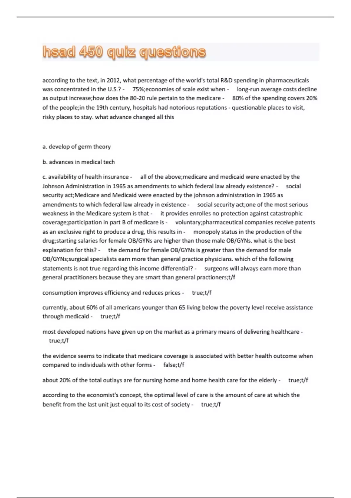 according to the text, in 2012, what percentage of the world's total R&D spending in pharmaceuticals was concentrated in the U.S.? - 75%;economies of scale exist when - long-run average costs decline as output increase;how does the 80-20 rule pertain to the medicare - 80% of the spending covers 20% of the people;in the 19th century, hospitals had notorious reputations - questionable places to visit, risky places to stay. what advance changed all this a. develop of germ theory b. advances in medical tech c. availability of health insurance - all of the above;medicare and medicaid were enacted by the Johnson Administration in 1965 as amendments to which federal law already existence? - social security act;Medicare and Medicaid were enacted by the johnson administration in 1965 as amendments to which federal law already in existence - social security act;one of the most serious weakness in the Medicare system is that - it provides enrolles no protection against catastrophic coverage;participation in part B of medicare is - voluntary;pharmaceutical companies receive patents as an exclusive right to produce a drug, this results in - monopoly status in the production of the drug;starting salaries for female OB/GYNs are higher than those male OB/GYNs. what is the best explanation for this? - the demand for female OB/GYNs is greater than the demand for male OB/GYNs;surgical specialists earn more than general practice physicians. which of the following statements is not true regarding this income differential? - surgeons will always earn more than general practitioners because they are smart than general practioners;t/f consumption improves efficiency and reduces prices - true;t/f currently, about 60% of all americans younger than 65 living below the poverty level receive assistance through medicaid - true;t/f most developed nations have given up on the market as a primary means of delivering healthcare - true;t/f the evidence seems to indicate that medicare coverage is associated with better health outcome when compared to individuals with other forms - false;t/f about 20% of the total outlays are for nursing home and home health care for the elderly - true;t/f according to the economist's concept, the optimal level of care is the amount of care at which the benefit from the last unit just equal to its cost of society - true;t/f