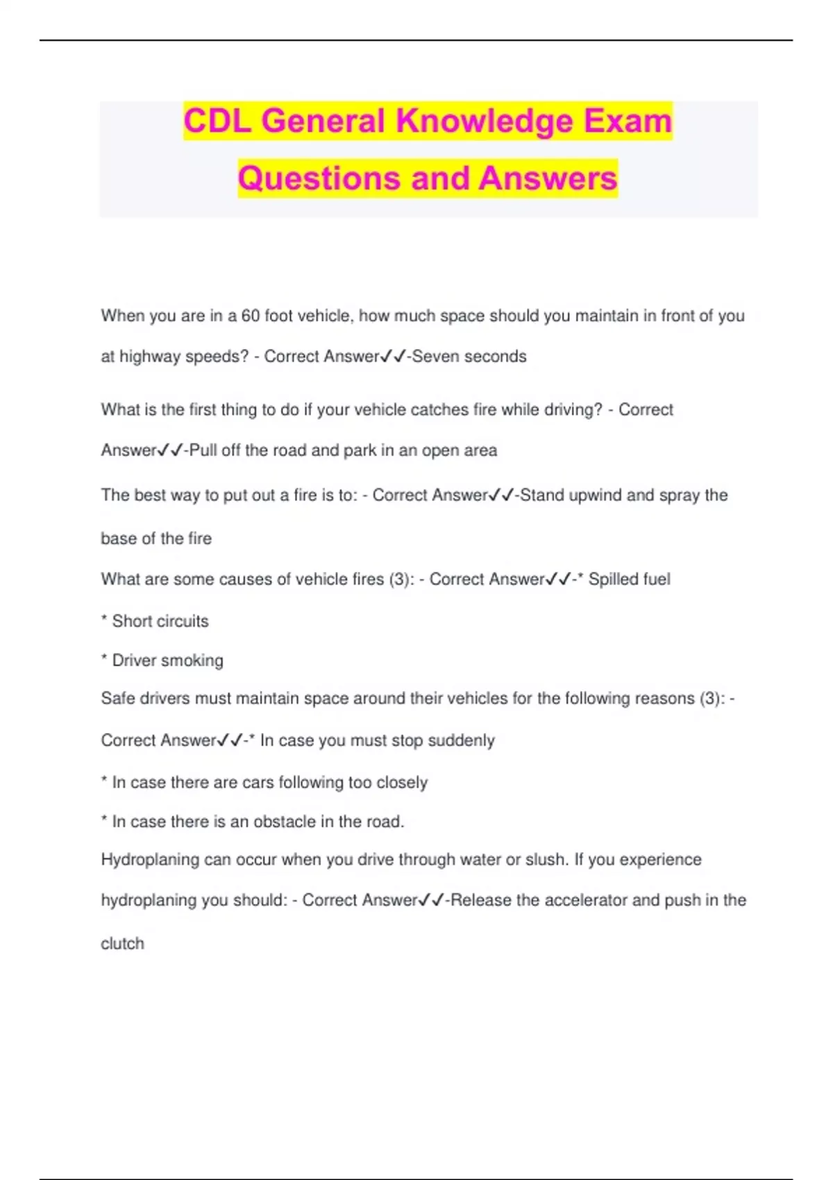 CDL General Knowledge Exam Questions and Answers When you are in a 60 foot vehicle, how much space should you maintain in front of you at highway speeds? - Correct Answer️️ -Seven seconds What is the first thing to do if your vehicle catches fire while driving? - Correct Answer️️ -Pull off the road and park in an open area The best way to put out a fire is to: - Correct Answer️️ -Stand upwind and spray the base of the fire What are some causes of vehicle fires (3): - Correct Answer️️ -* Spilled fuel * Short circuits * Driver smoking Safe drivers must maintain space around their vehicles for the following reasons (3): - Correct Answer️️ -* In case you must stop suddenly * In case there are cars following too closely * In case there is an obstacle in the road. Hydroplaning can occur when you drive through water or slush. If you experience hydroplaning you should: - Correct Answer️️ -Release the accelerator and push in the clutch When making a right hand turn, you should always: - Correct Answer️️ -Keep the rear of your vehicle close to the curb A front wheel skid is usually caused by (3): - Correct Answer️️ -* Driving too fast for conditions * Lack of tread on the front tires * Cargo improperly loaded Driving at night is more dangerous because of the following (3): - Correc