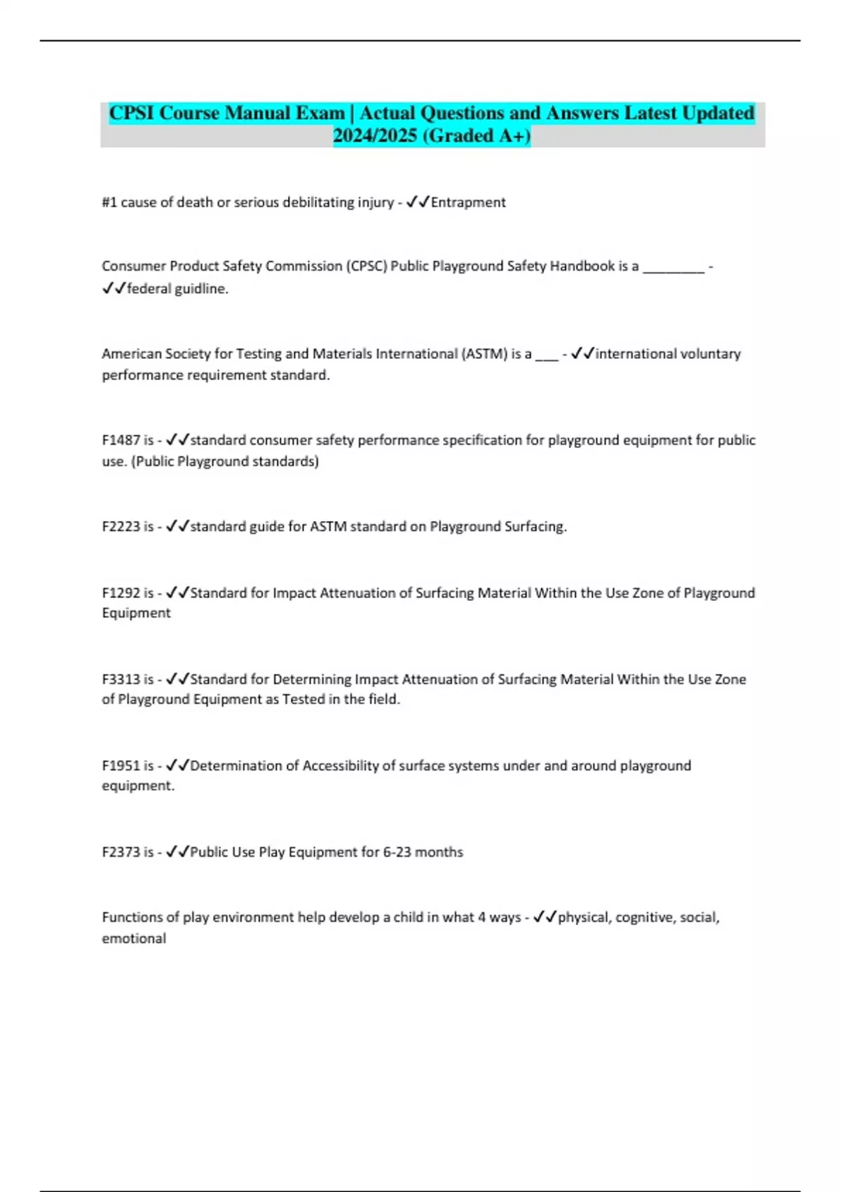 Package deal:: CPSI Exams | Actual Questions And Answers Latest Updated 2024/2025 (Graded A+)