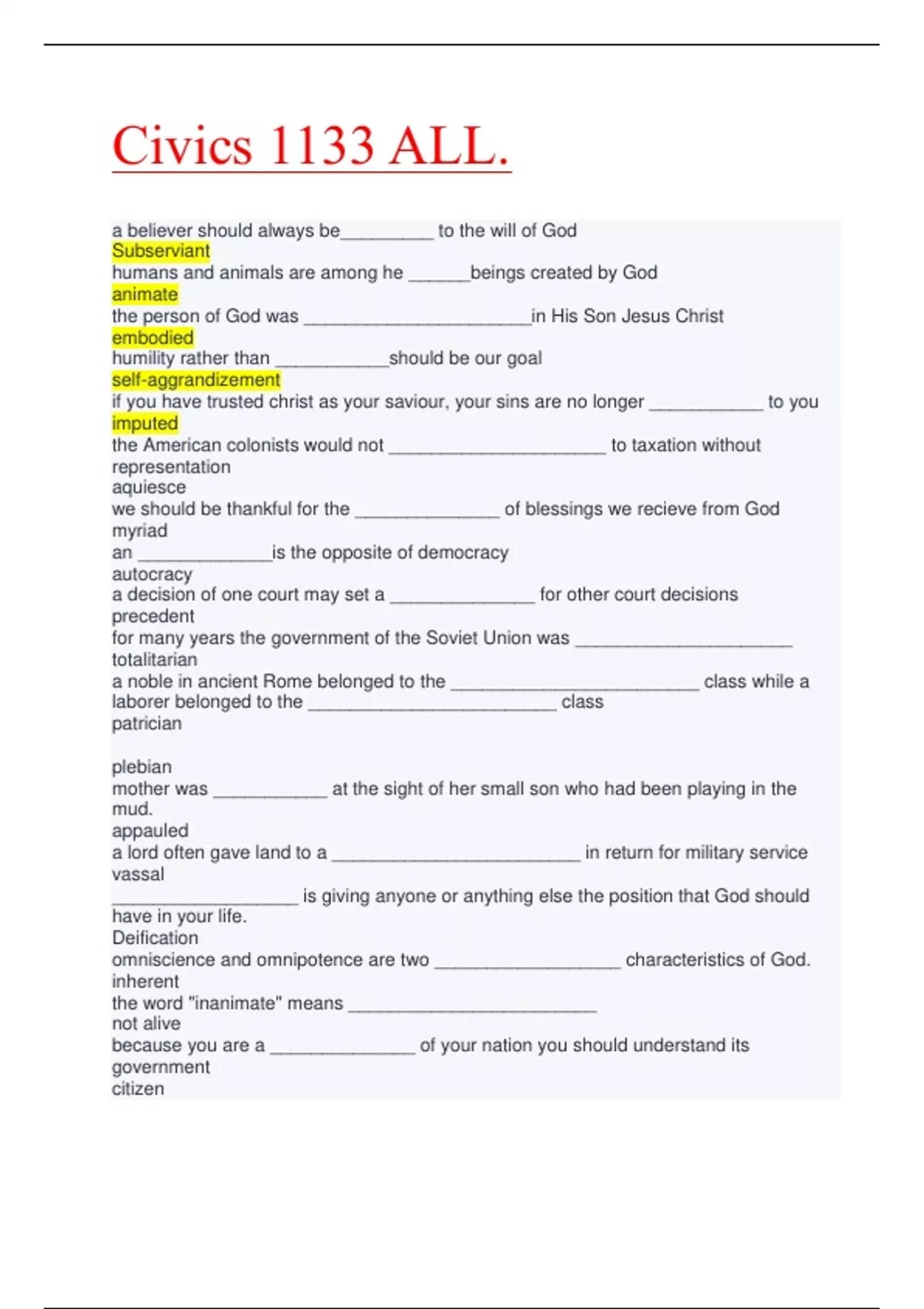 for many years the government of the Soviet Union was _____________________ totalitarian a noble in ancient Rome belonged to the ________________________ class while a laborer belonged to the ________________________ class patrician plebian mother was ___________ at the sight of her small son who had been playing in the mud. appauled a lord often gave land to a ________________________ in return for military service vassal __________________ is giving anyone or anything else the position that God should have in your life. Deification omniscience and omnipotence are two __________________ characteristics of God. inherent the word "inanimate" means ________________________ not alive because you are a ______________ of your nation you should understand its government citizen