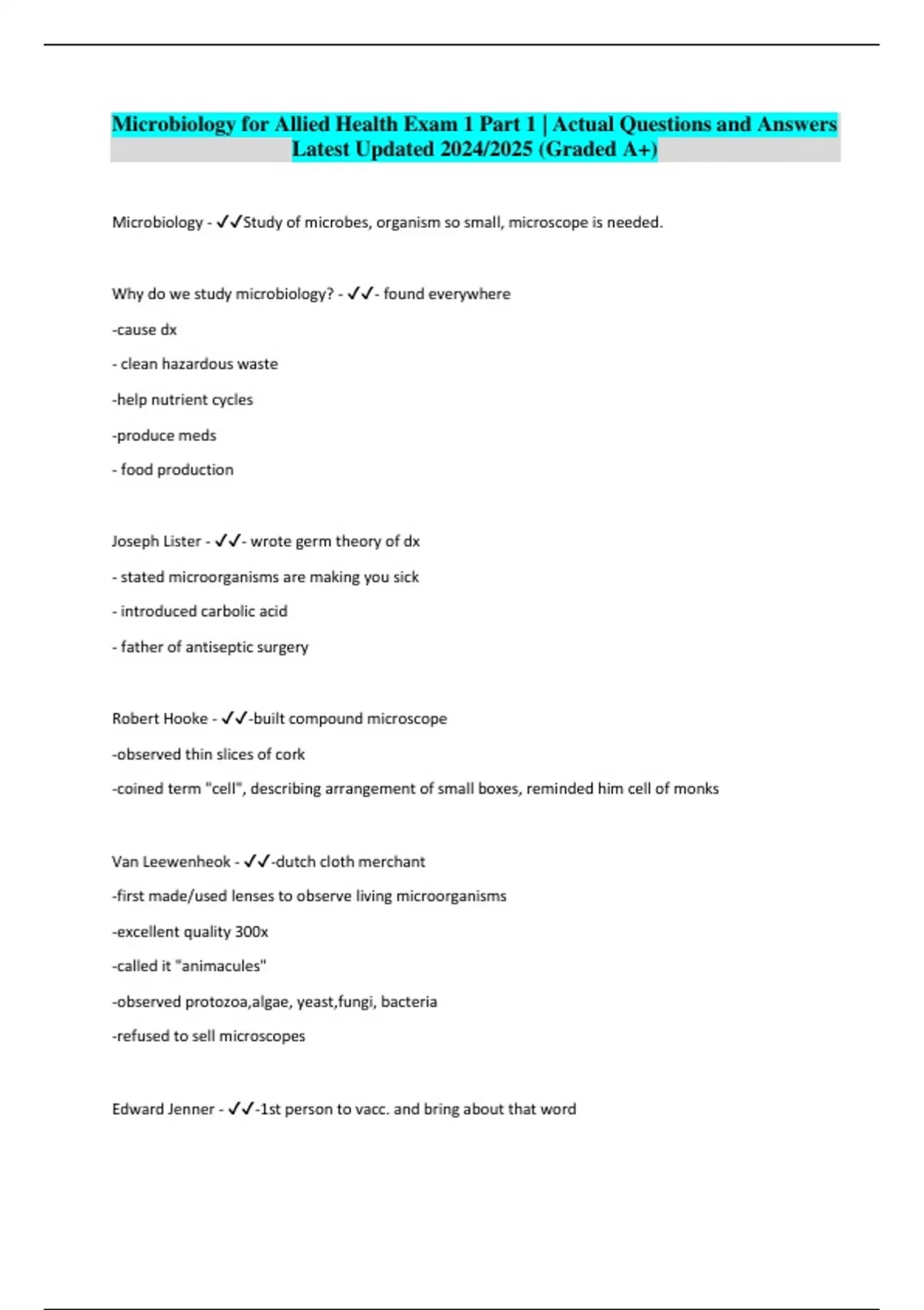Microbiology for Allied Health Exam 1 Part 1 | Actual Questions and Answers Latest Updated 2024/2025 (Graded A+)
