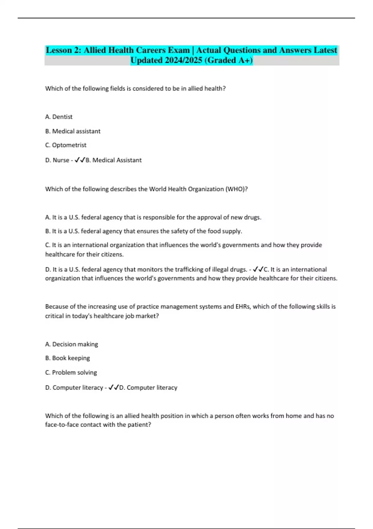 Lesson 2: Allied Health Careers Exam | Actual Questions and Answers Latest Updated 2024/2025 (Graded A+)