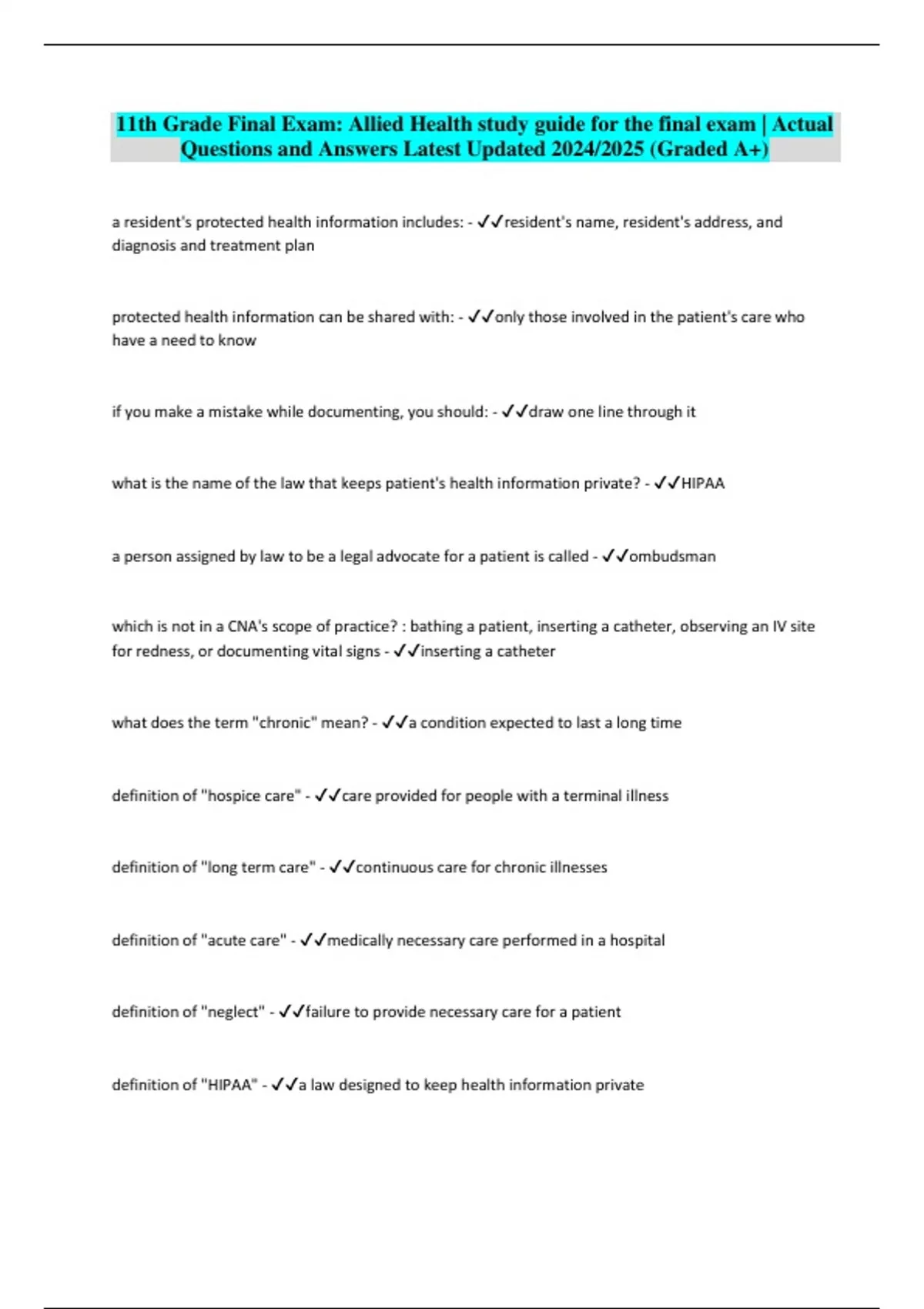 11th Grade Final Exam: Allied Health study guide for the final exam | Actual Questions and Answers Latest Updated 2024/2025 (Graded A+)