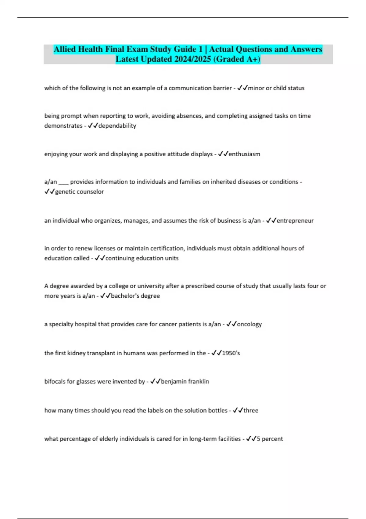 Allied Health Final Exam Study Guide 1 | Actual Questions and Answers Latest Updated 2024/2025 (Graded A+)