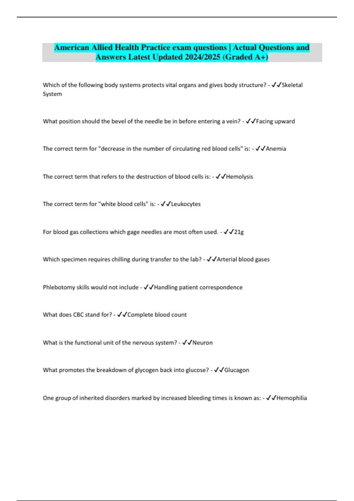 American Allied Health Practice exam questions | Actual Questions and Answers Latest Updated 2024/2025 (Graded A+)