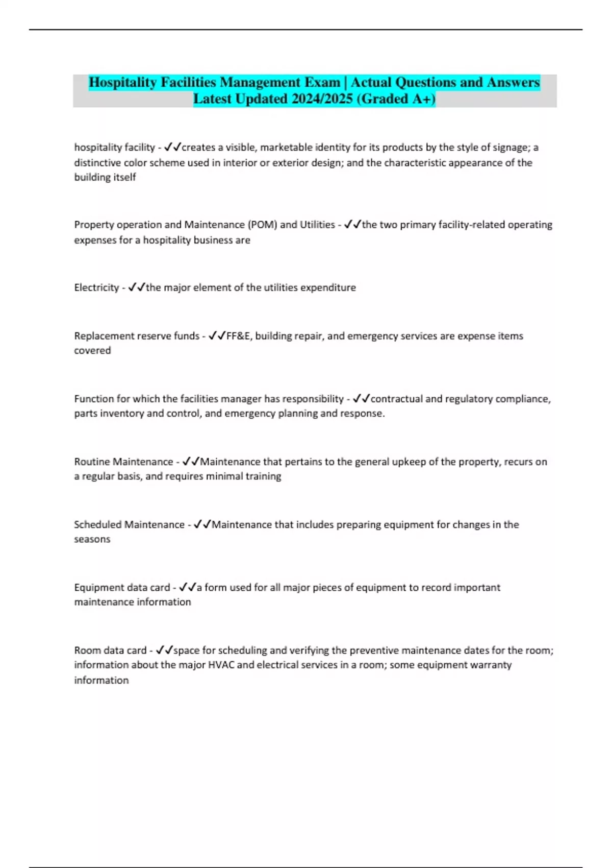 Hospitality Facilities Management Exam | Actual Questions and Answers Latest Updated 2024/2025 (Graded A+)