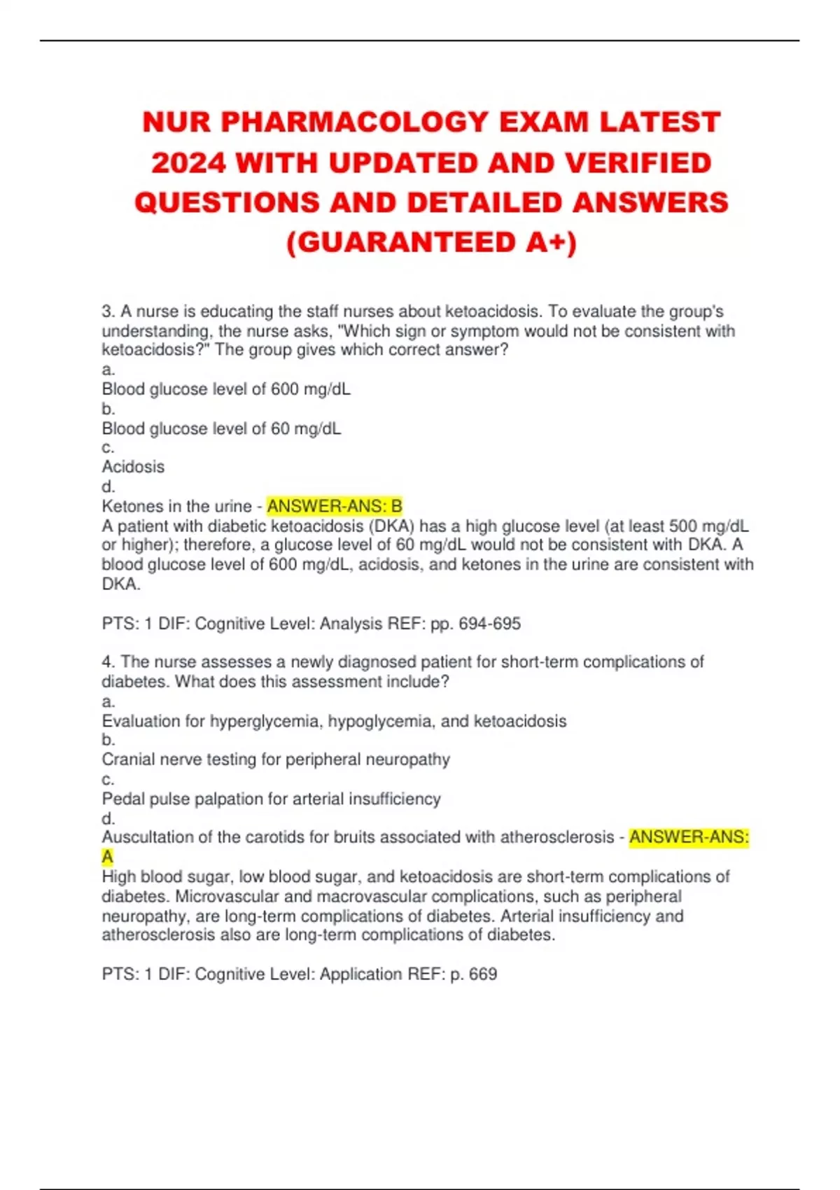 NUR PHARMACOLOGY EXAM LATEST 2024 WITH UPDATED AND VERIFIED QUESTIONS AND DETAILED ANSWERS (GUARANTEED A+) 3. A nurse is educating the staff nurses about ketoacidosis. To evaluate the group's understanding, the nurse asks, "Which sign or symptom would not be consistent with ketoacidosis?" The group gives which correct answer? a. Blood glucose level of 600 mg/dL b. Blood glucose level of 60 mg/dL c. Acidosis d. Ketones in the urine - ANSWER-ANS: B A patient with diabetic ketoacidosis (DKA) has a high glucose level (at least 500 mg/dL or higher); therefore, a glucose level of 60 mg/dL would not be consistent with DKA. A blood glucose level of 600 mg/dL, acidosis, and ketones in the urine are consistent with DKA. PTS: 1 DIF: Cognitive Level: Analysis REF: pp. 694-695 4. The nurse assesses a newly diagnosed patient for short-term complications of diabetes. What does this assessment include? a. Evaluation for hyperglycemia, hypoglycemia, and ketoacidosis b. Cranial nerve testing for peripheral neuropathy c. Pedal pulse palpation for arterial insufficiency d. Auscultation of the carotids for bruits associated with atherosclerosis - ANSWER-ANS: A High blood sugar, low blood sugar, and ketoacidosis are short-term complications of diabetes. Microvascular and macrovascular complications, such as peripheral neuropathy, are long-term complications of diabetes. Arterial insufficiency and atherosclerosis also are long-term complications of diabetes. PTS: 1 DIF: Cognitive Level: Application REF: p. 669 5. Which statement is accurate about the long-term complications of diabetes? a. Long-term complications are almost always the result of hypoglycemia and ketoacidosis. b. The complication rates for patients with optimally controlled type 2 diabetes are the same as for those whose disease is not optimally controlled. c. Optimal control of type 1 diabetes produces excessive episodes of life-threatening hypoglycemia. d. Optimal control of both types of diabetes reduces the risk of eye, kidney, and nerve damage. - ANSWER-ANS: D In both types of diabetes, optimal control of the disease slows the development of microvascular complications. Short-term complications are more apt to result from hypoglycemia and ketoacidosis. Patients with type 2 diabetes have fewer complications if their blood sugar level is optimally controlled. Hypoglycemia does not occur more frequently in patients with optimally controlled type 1 diabetes. PTS: 1 DIF: Cognitive Level: Comprehension REF: p. 669 1. The nurse working on a high-acuity medical-surgical unit is prioritizing care for four patients who were just admitted. Which patient should the nurse assess first? a. The NPO patient with a blood glucose level of 80 mg/dL who just received 20 units of 70/30 Novolin insulin b. The patient with a pulse of 58 beats per minute who is about to receive digoxin [Lanoxin] c. The patient with a blood pressure of 136/92 mm Hg who complains of having a headache d. The patient with an allergy to penicillin who is receiving an infusion of vancomycin [Vancocin] - ANSWER-ANS: A The NPO patient with hypoglycemia who just received 70/30 Novolin insulin takes priority, because this patient needs to consume a good source of glucose immediately or perhaps the NPO status will be discontinued for this shift. The digoxin may be withheld for the patient with a pulse of 58 beats per minute, but this is not a priority action. The patient with a headache needs to be followed up, but because the blood pressure is 136/92 mm Hg, the headache is probably not caused by hypertension. The patient with an allergy to penicillin will not have a reaction to the vancomycin. PTS: 1 DIF: Cognitive Level: Analysis REF: p. 676 | pp. 678-679 2. A patient with type 1 diabetes is eating breakfast at 7:30 AM. Blood sugars are on a sliding scale and are ordered before a meal and at bedtime. The patient's blood sugar level is 317 mg/dL. Which formulation of insulin should the nurse prepare to administer? a. No insulin should be administered. b. NPH c. 70/30 mix d. Lispro [Humalog] - ANSWER-ANS: D