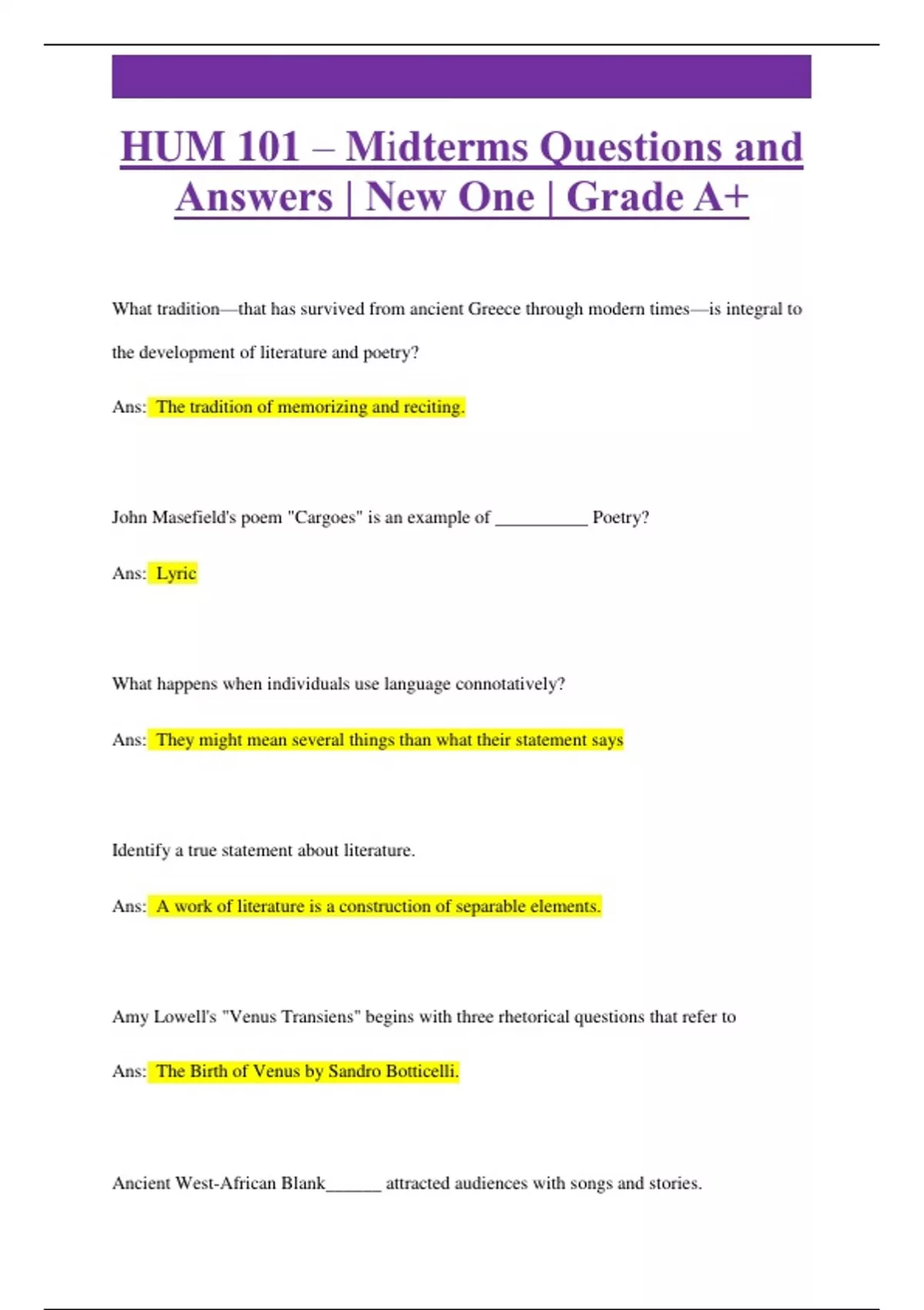 HUM 101 – Midterms Questions and Answers | New One | Grade A+